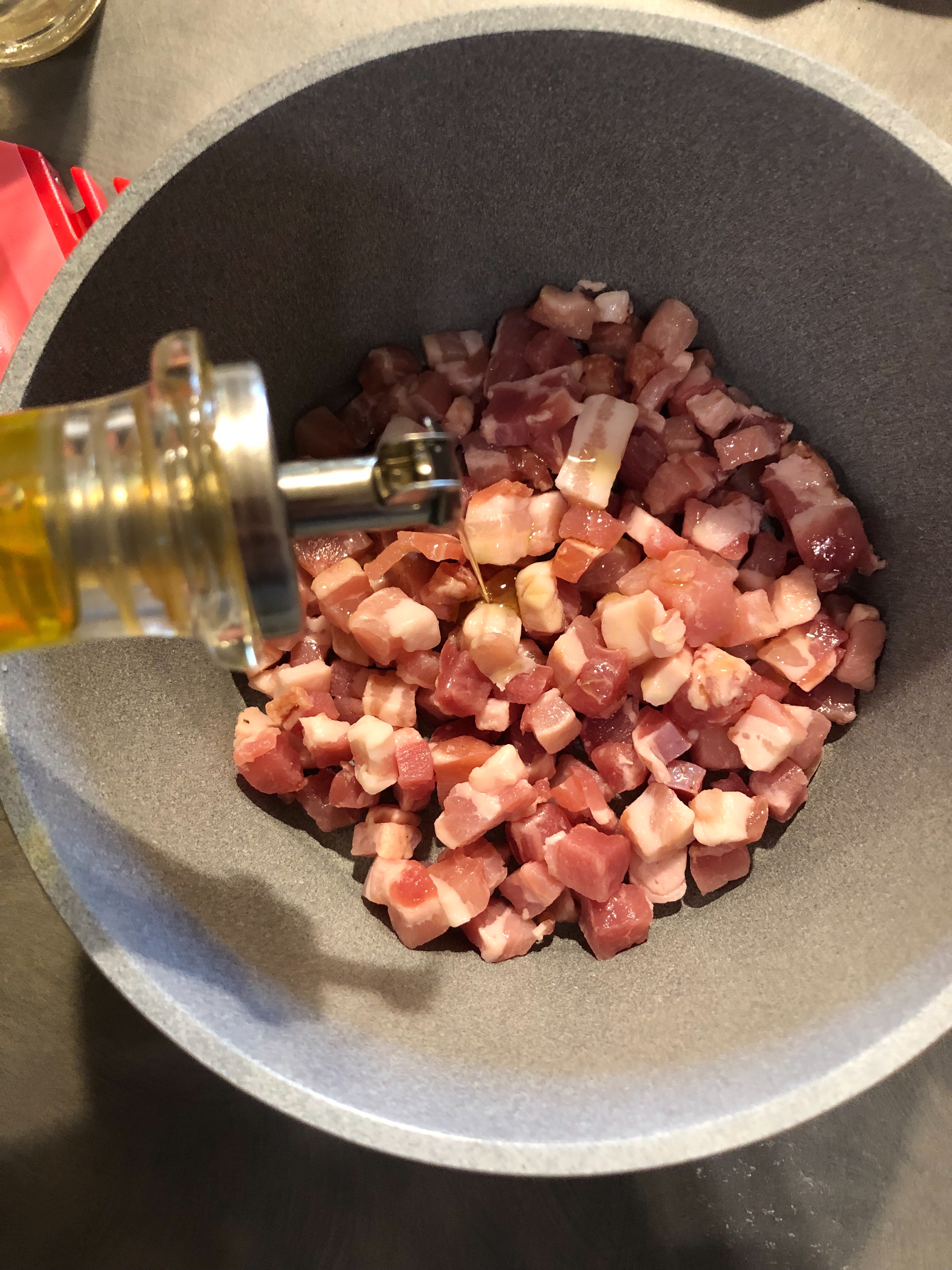In un larga padella verso abbondante olio extravergine, aggiungo la pancetta a cubetti, il porro e lascio rosolare