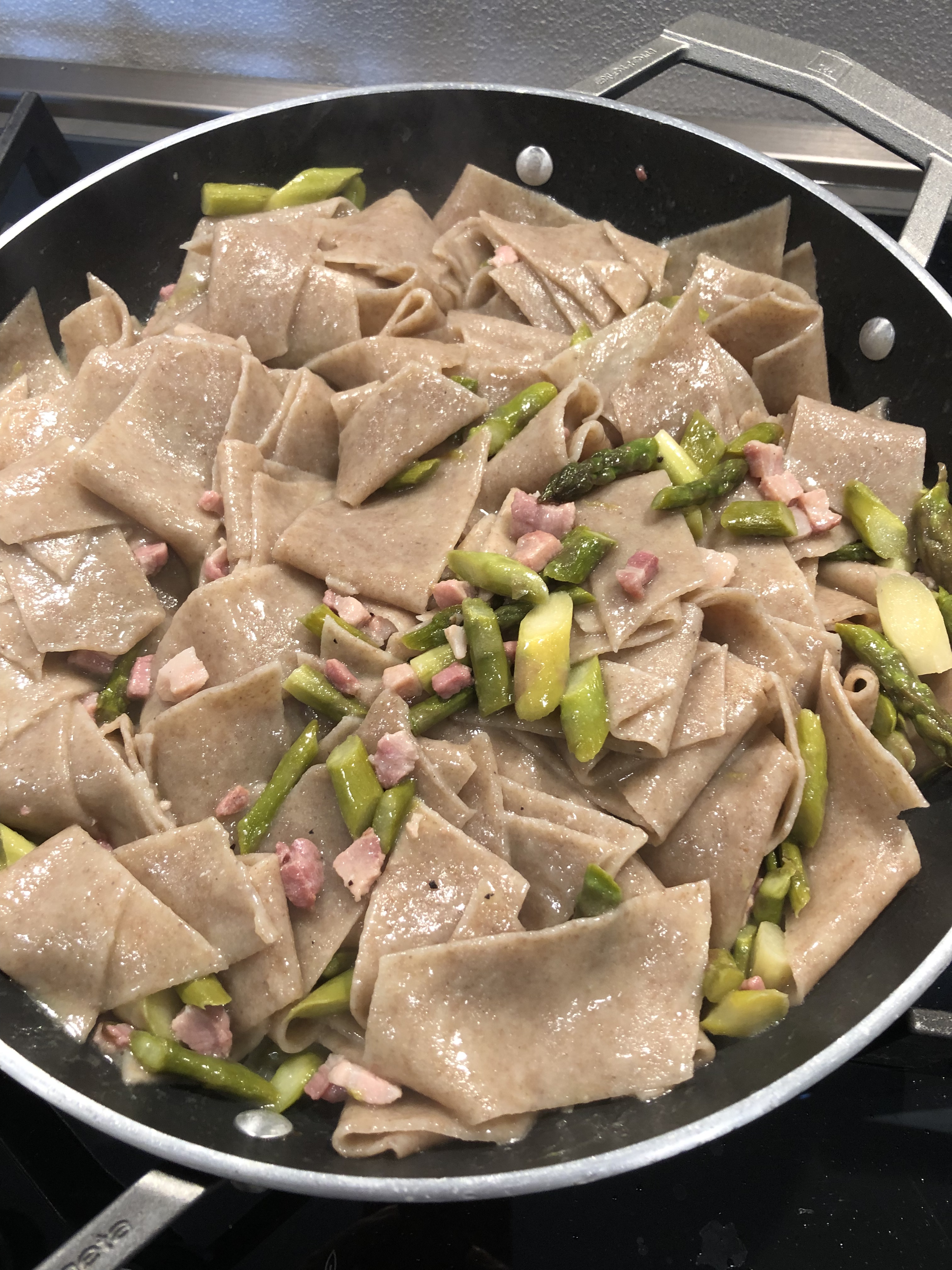 In un pentolino verso dell”olio extravergine, lo scaldo e verso la pancettaLascio rosolare poi sfumo con il vino biancoCopro e lascio stufare per una decina di minuti, intanto lavo e pulisco gli asparagi togliendo la parte più dura e la parte terminale del gamboTaglio gli asparagi in piccoli pezzetti obliquiCondisco con sale pepe e olio come un’insalataVerso gli asparagi e li spadello a fuoco vivace li cuocio per pochi minuti, devono rimanere croccantiAggiungo la pancetta stufata con il suo sughettoMescolo benePrendo i maltagliati che avevo preparato il giorno prima e conservati stesi a strati con carta forno e coperti con pellicolaLi lesso in acqua salata per pochi minuti, hanno una cottura velocissimaLi scolo e li aggiungo al sugo mescolando delicatamente e aggiungendo qualche cucchiaio di acqua di cottura della pastaHo precedentemente lessato due uova mettendole in un pentolino con acqua fredda, porto ad ebollizione e calcolo 10 minuti di cottura partendo dal momento dell’inizio del bollore quindi li raffreddo con il guscio in acqua fredda, poi li sguscioImpiatto i maltatagliati, aggiungo una spolverata di parmigiano grattugiato del tuorlo sbriciolato e termino con un filo di olio
