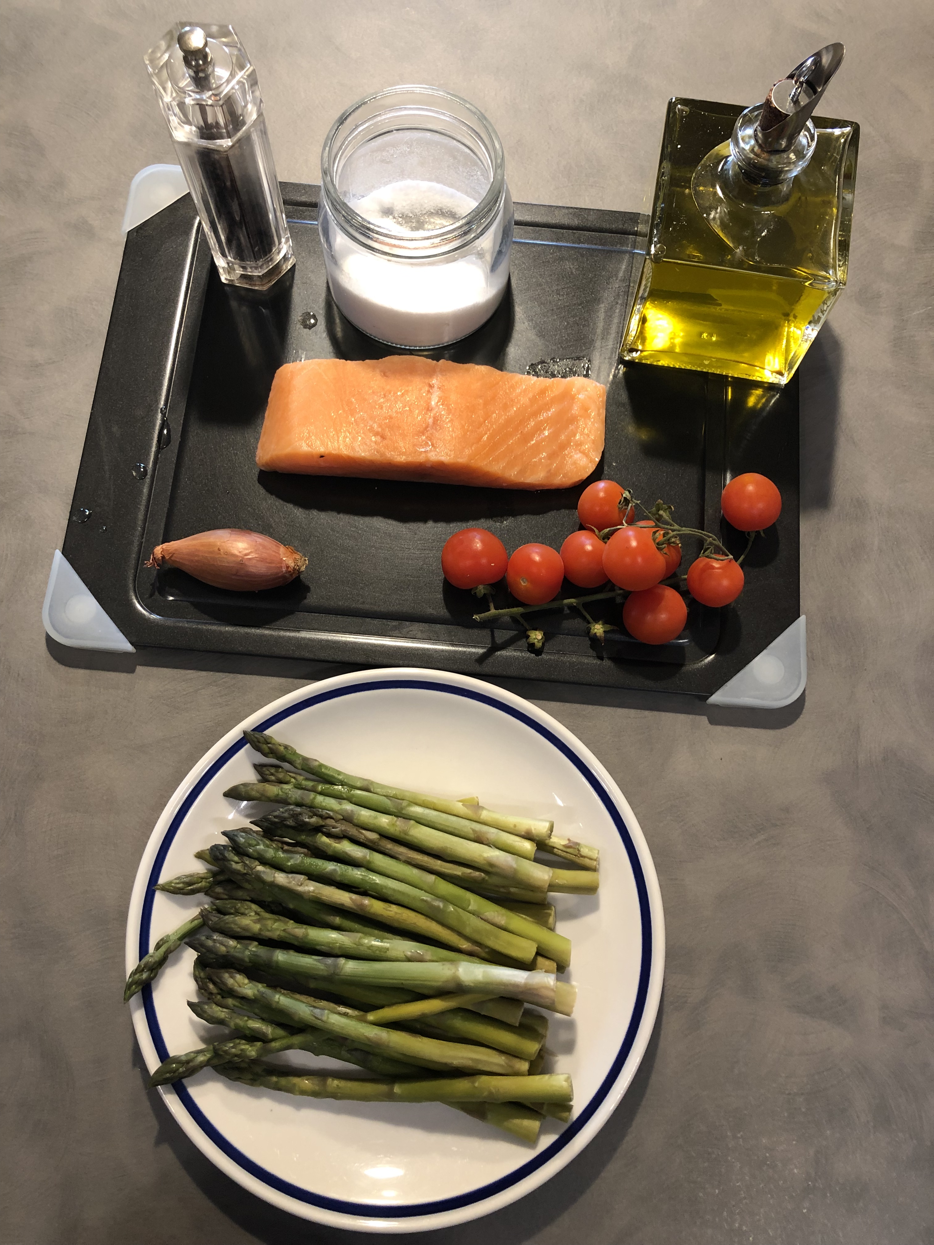 PEPECuocio a vapore per 10 minuti gli asparagi lasciandoli croccantiTrito lo scalognoLo metto in una larga padella con abbondante olio e lascio soffriggereTaglio gli asparagi a pezzetti tenendo le punte intereLe aggiungo al soffritto di scalognoTaglio i pomodori in piccoli pezzi e li aggiungo agli asparagiLascio cuocere pochi minuti, intanto tolgo la pelle al salmoneLo taglio a cubetti piccoliAggiungo anche il salmone agli asparagi e aggiungo sale e pepeCuocio le linguine in acqua e salata, le tolgo al dente e la trasferisco nel sugo aggiungendo qualche cucchiaio di acqua di cottura, manteco per bene aggiungendo un filo di olio Se vi piace potete utilizzare olio piccante per dare una spinta in più