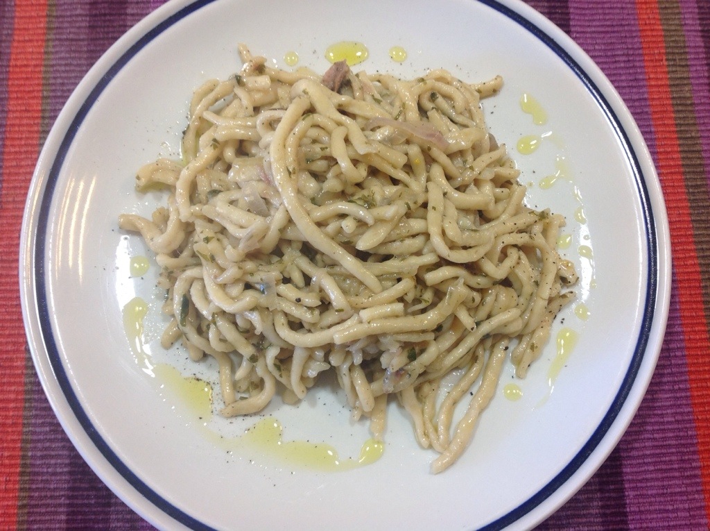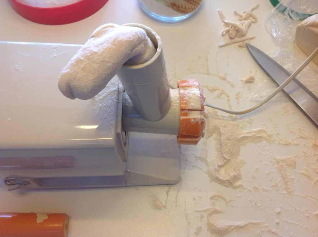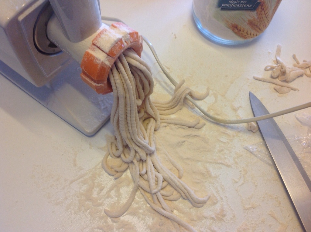 Non avendo il torchio per i bigoli potevo decidere di tirare la pasta tagliare delle striscioline di mezzo cm e arrotolarle, io ho fatto un esperimento, ho adoperato il tritacarne senza mettere le lame, è importante che l’impasto sia piuttosto duro