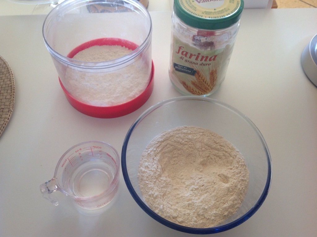 Ho mescolato le due farine in una ciotola e ho versato l’acqua, procedo versandone poca per volta potrebbe servirne di meno o di più dipende da quanta acqua assorbe la farina