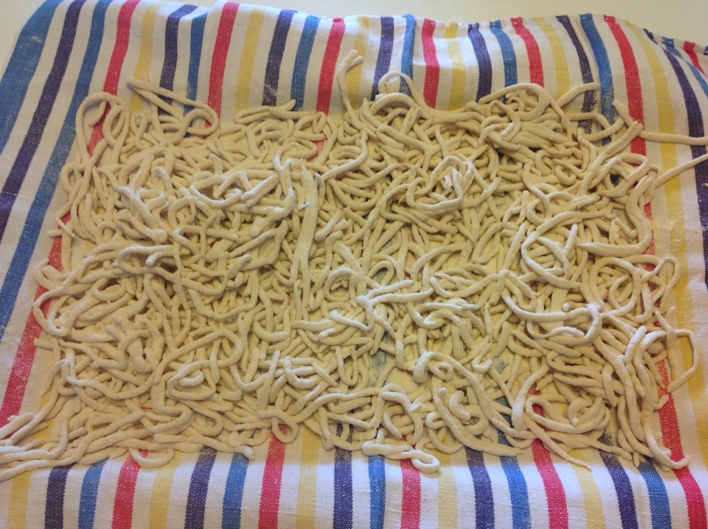 È importante ! Man mano che escono i bigoli bisogna spolverizzarli con la farina cercando di dividerli
