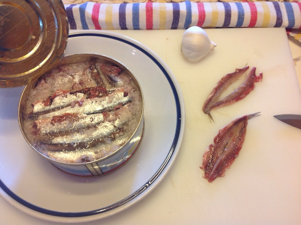 Pulisco le acciughe( vedi procedimento sul blog “alici sott’olio”) sotto l’acqua corrente togliendo la lisca centrale ottengo dei filetti che lavo bene