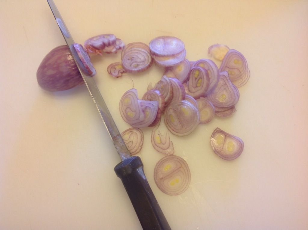 Pulisco e affetto gli scalogni o le cipolle e li taglio sottili