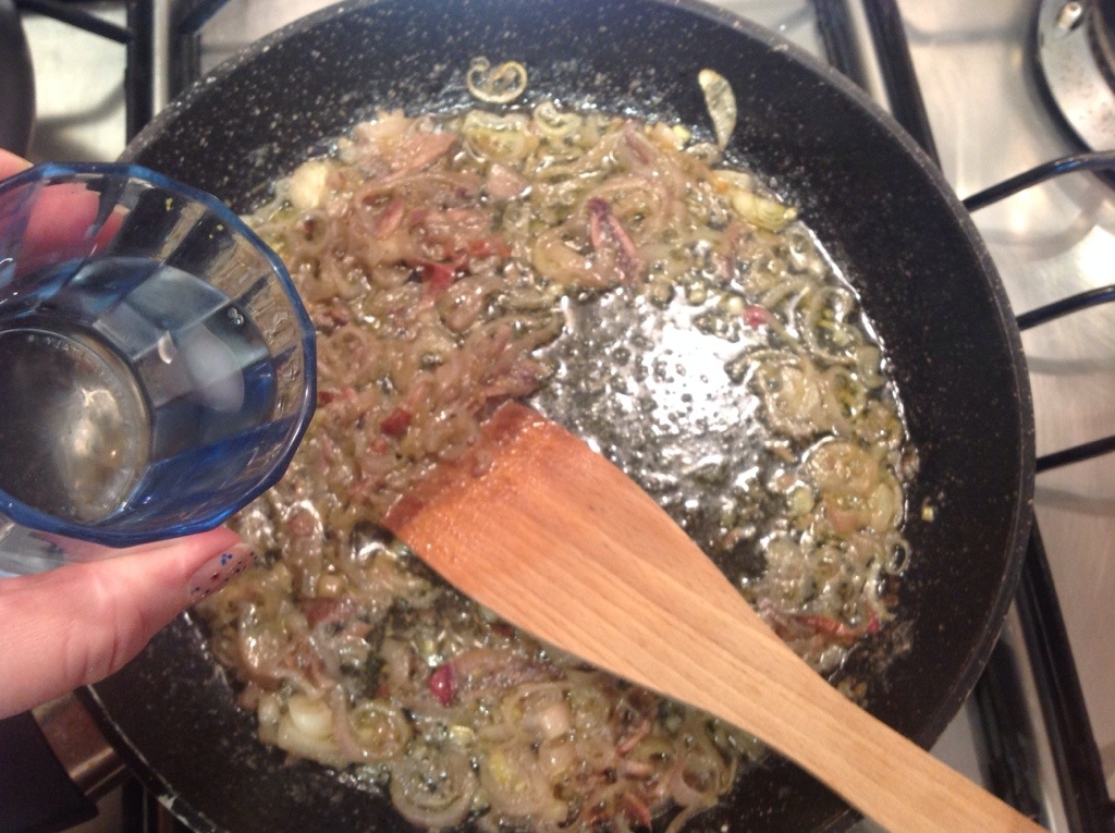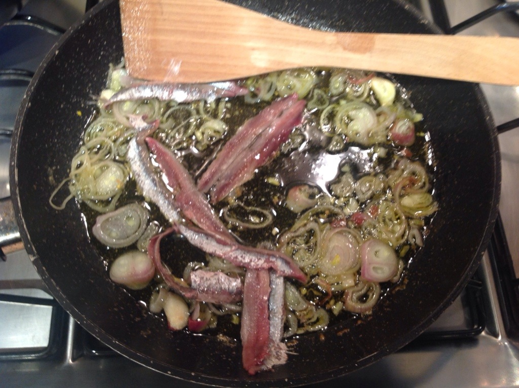Aggiungo gli scalogni e li lascio appassire quindi aggiungo le acciughe e le sciolgo