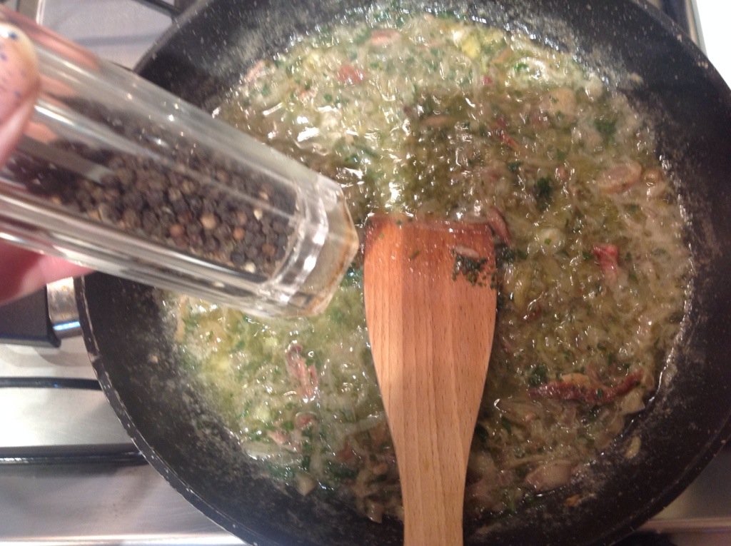 Aggiungo una manciata di prezzemolo tritato e una macinata di pepe, unisco un goccio di acqua deve restare un sugo piuttosto liquido assaggio di sale, ricordate la pasta non è salata