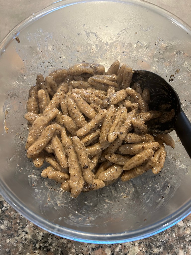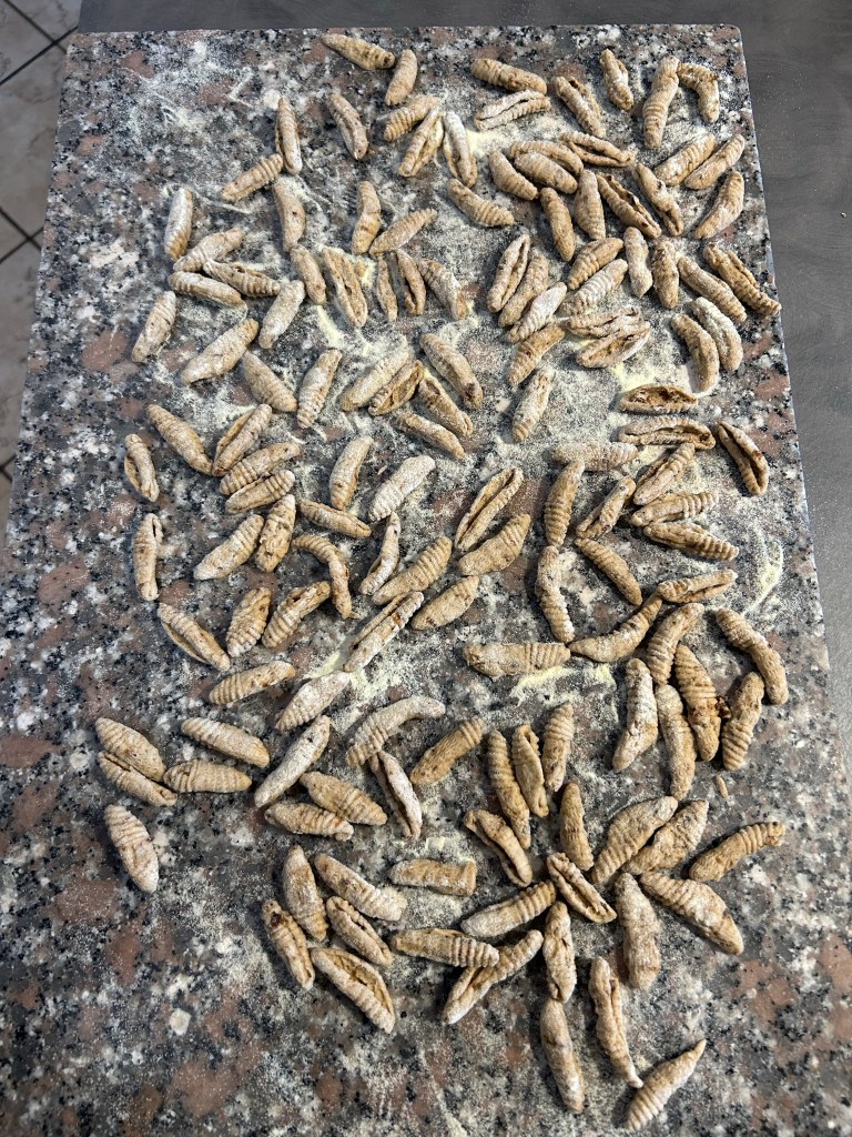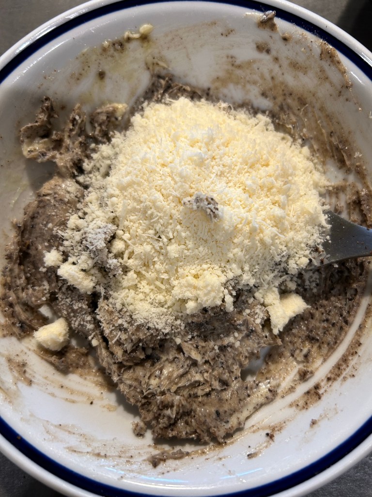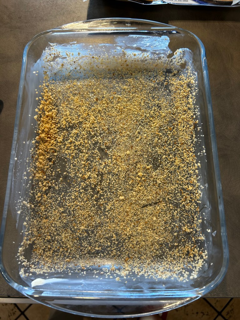 Cospargo con abbondante formaggio grattugiato e una spolverata di pane grattugiato, una macinata di pepe, un pizzico di sale e fiocchetti di burro