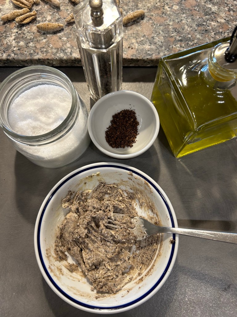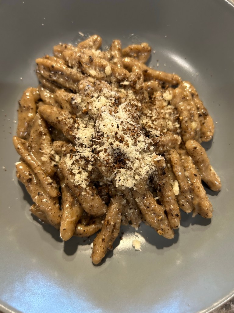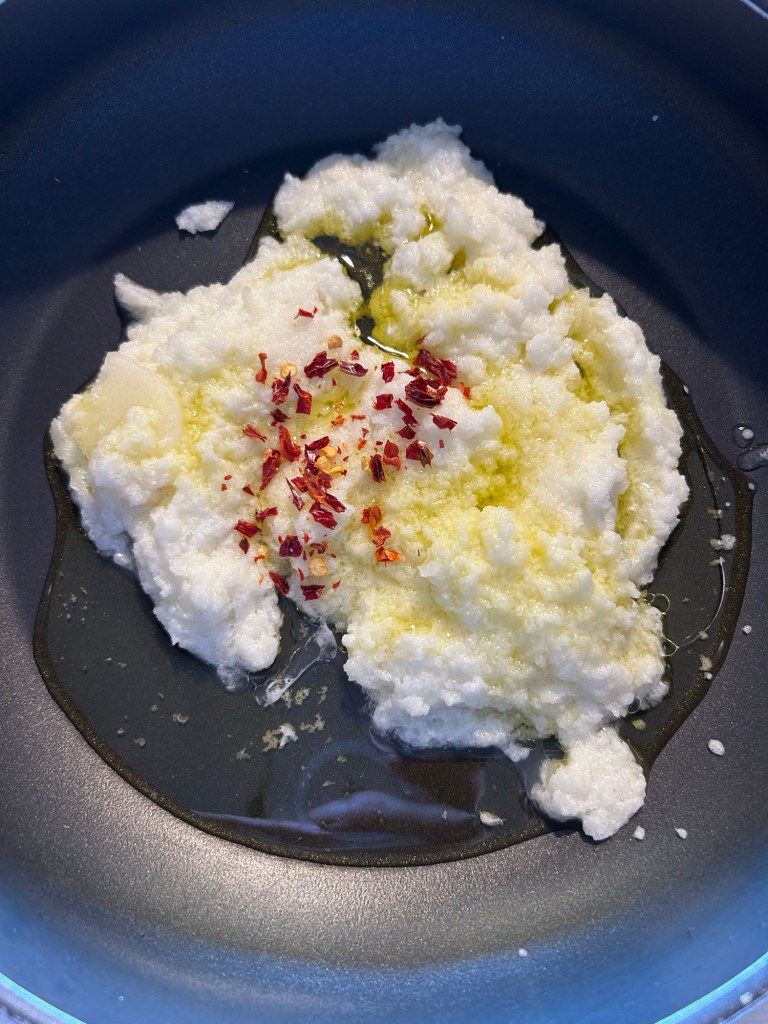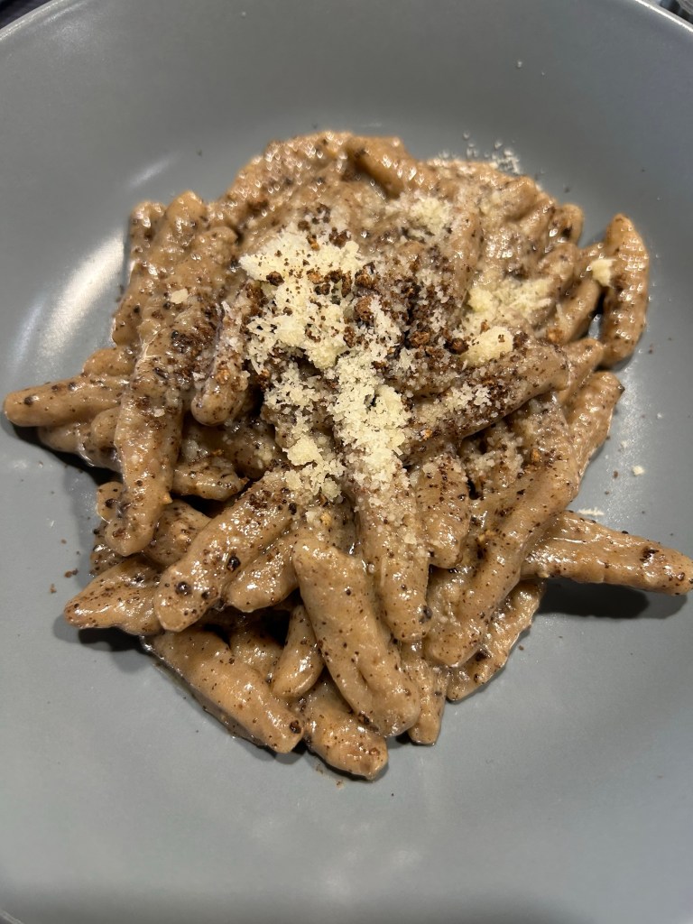 Cospargo con abbondante formaggio grattugiato e una spolverata di pane grattugiato, una macinata di pepe, un pizzico di sale e fiocchetti di burro