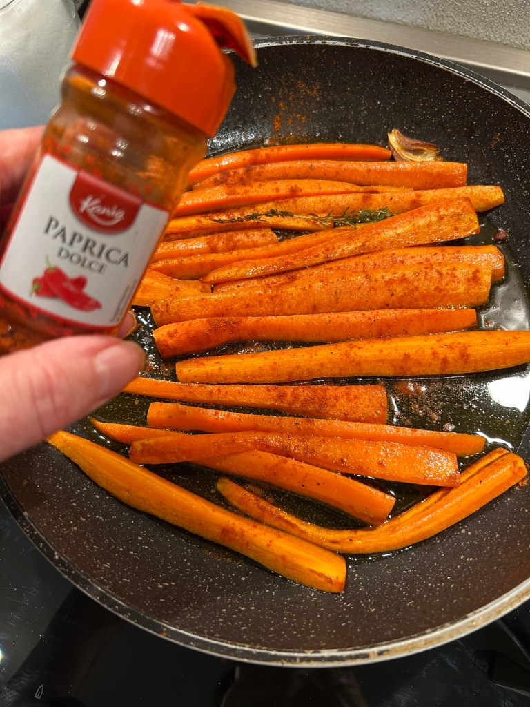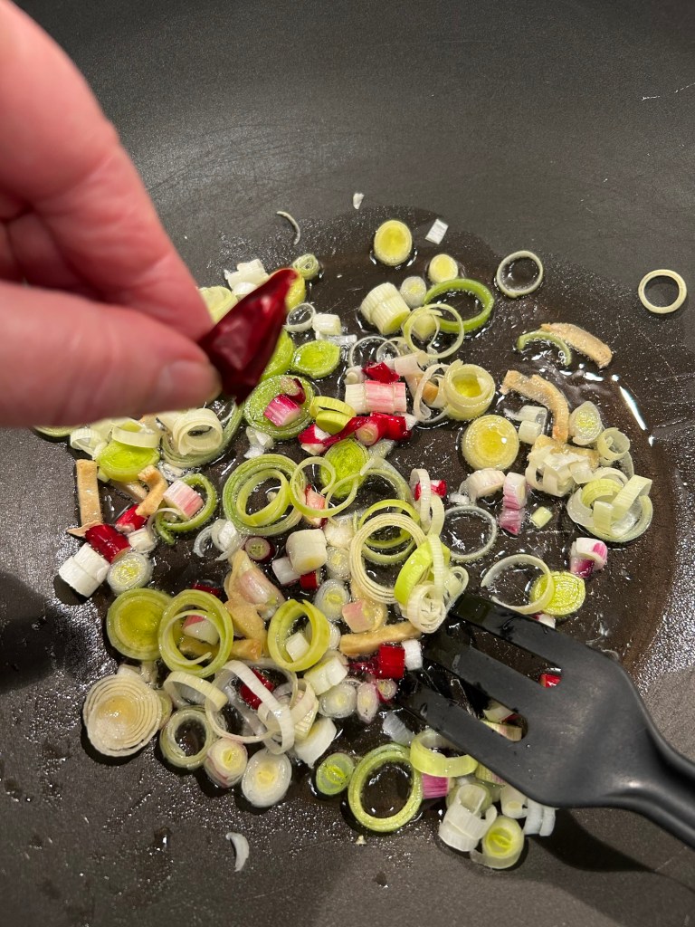 In una padella verso un goccio di olio e cuocio la cipolla e le carote lasciandole croccanti