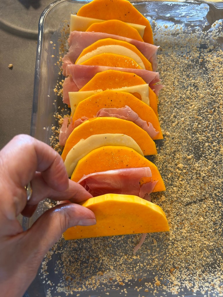 Dispongo una fettina di zucca, alterno con una fettina di formaggio, una di zucca, una fettina di prosciutto e così via, alternando i vari tipi di formaggio