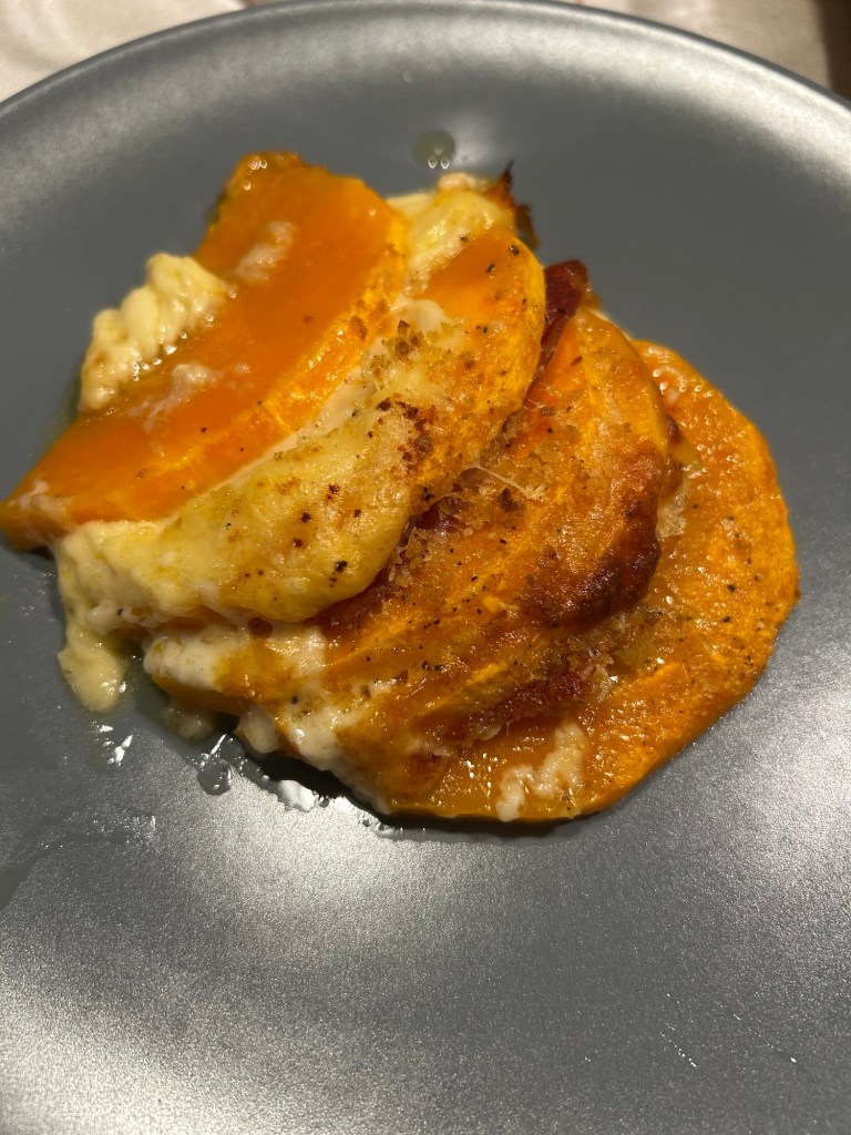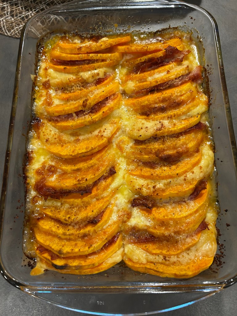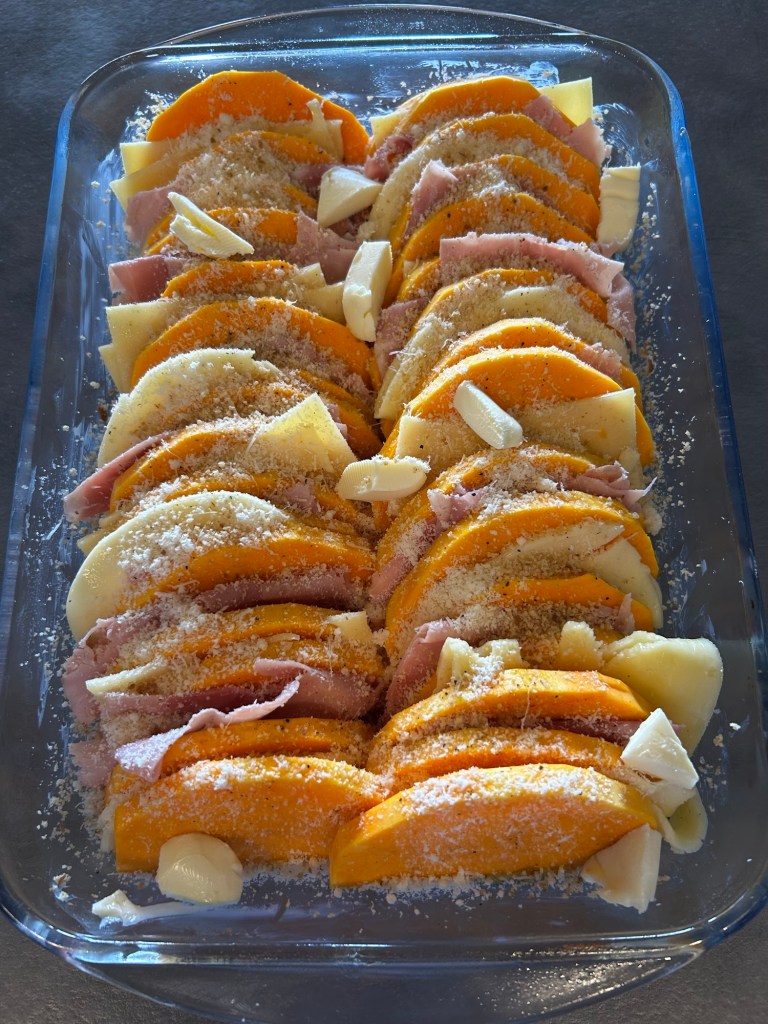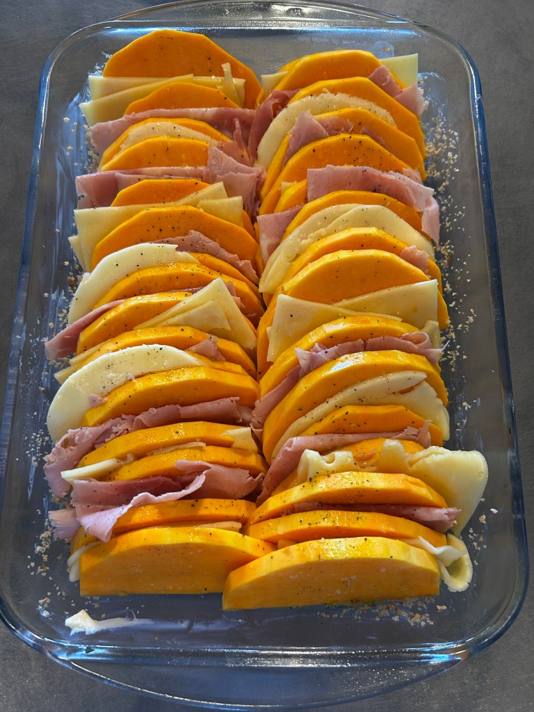 Tempo di zucca, versatile per ricette dolci e salate, una ricetta veramente buona, con il formaggio filante e una crosticina deliziosa, un piatto completo, potete utilizzare la zucca che preferite ma la Butter si presta benissimo perché si ottengono fettine perfette, io ho utilizzato vari tipi di fettine di formaggio per rendere ancora la ricetta più gustosa,la dose di formaggio e prosciutto dipenderà dalla vostra teglia