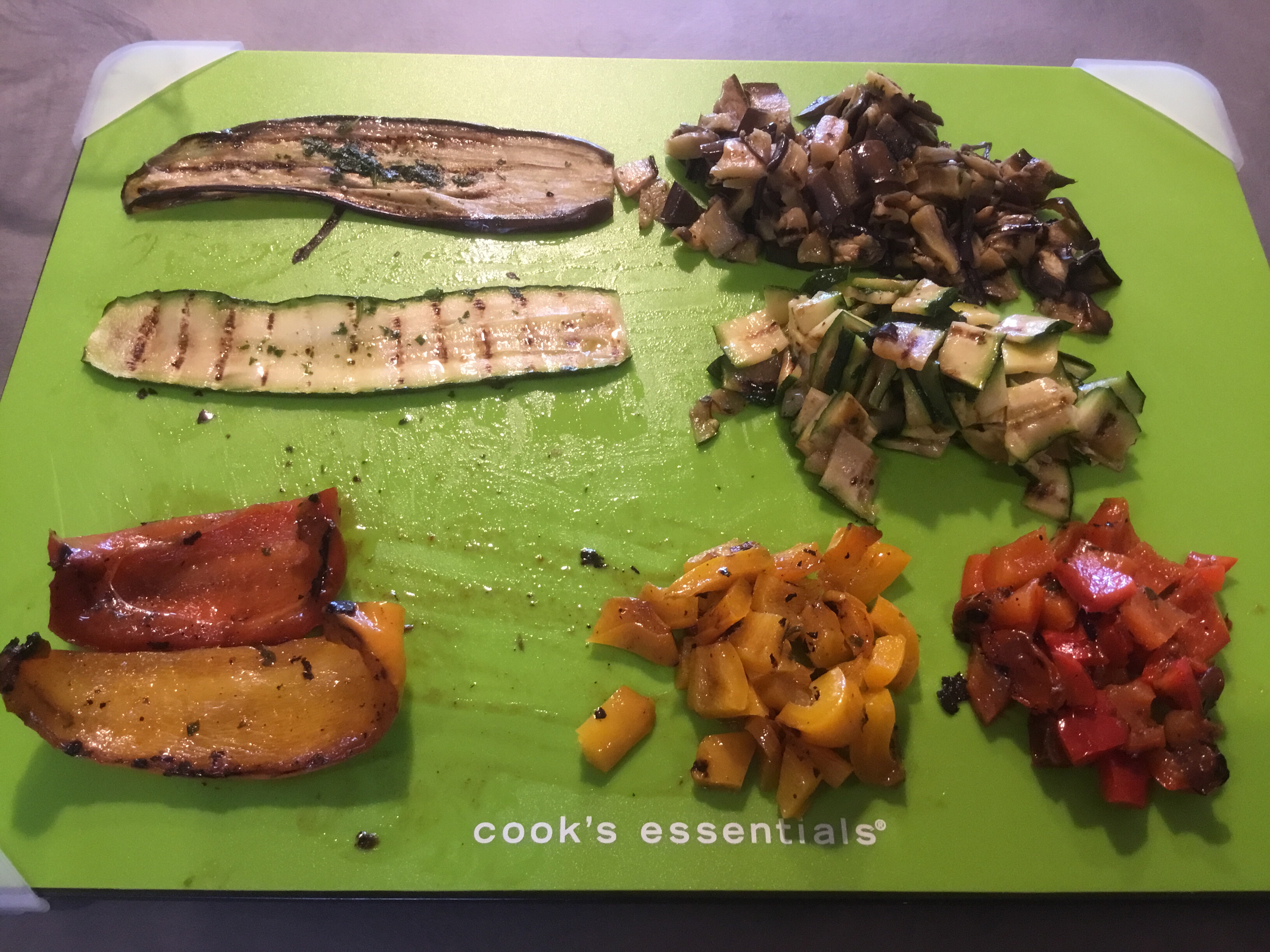 Intanto preparo le verdure, io ho utilizzato le zucchine, le melanzane e i peperoni di una ricetta precedente che avevo semplicemente grigliate, le ho poi tagliate a dadini piccoli, le dosi sono indicative, potete aggiungerne più o meno a vostro gusto e aggiungerne di nuove