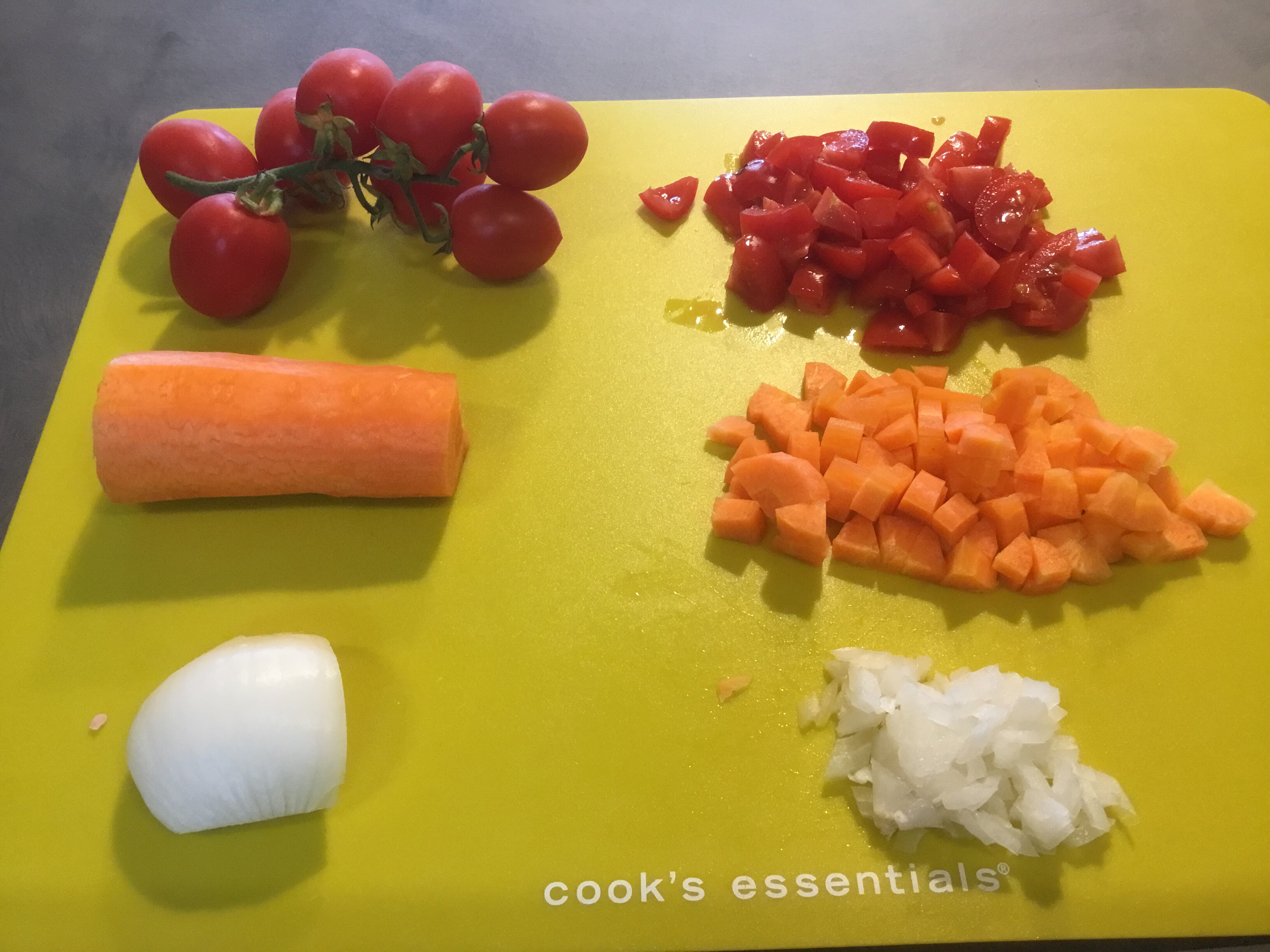 Taglio a cubetti piccoli la carota, i pomodorini e la cipolla