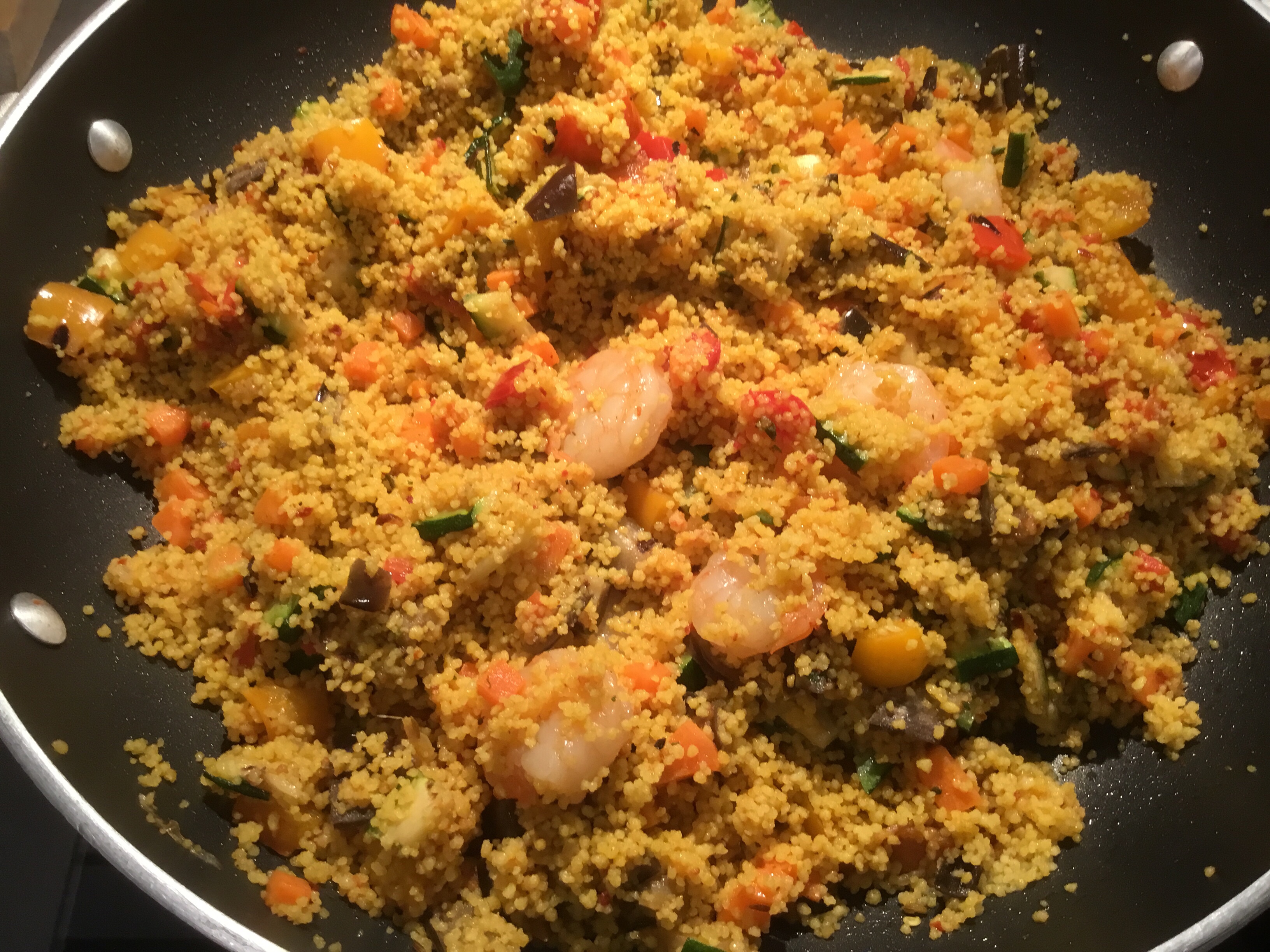 Un piatto leggero dal profumo e dal gusto intenso, io ho utilizzato un cous cous già speziato, se non lo trovate, aggiungete voi le spezie che più vi piacciono, curcuma, curry, paprica…..Se poi lo volete vegetariano eliminate i gamberi