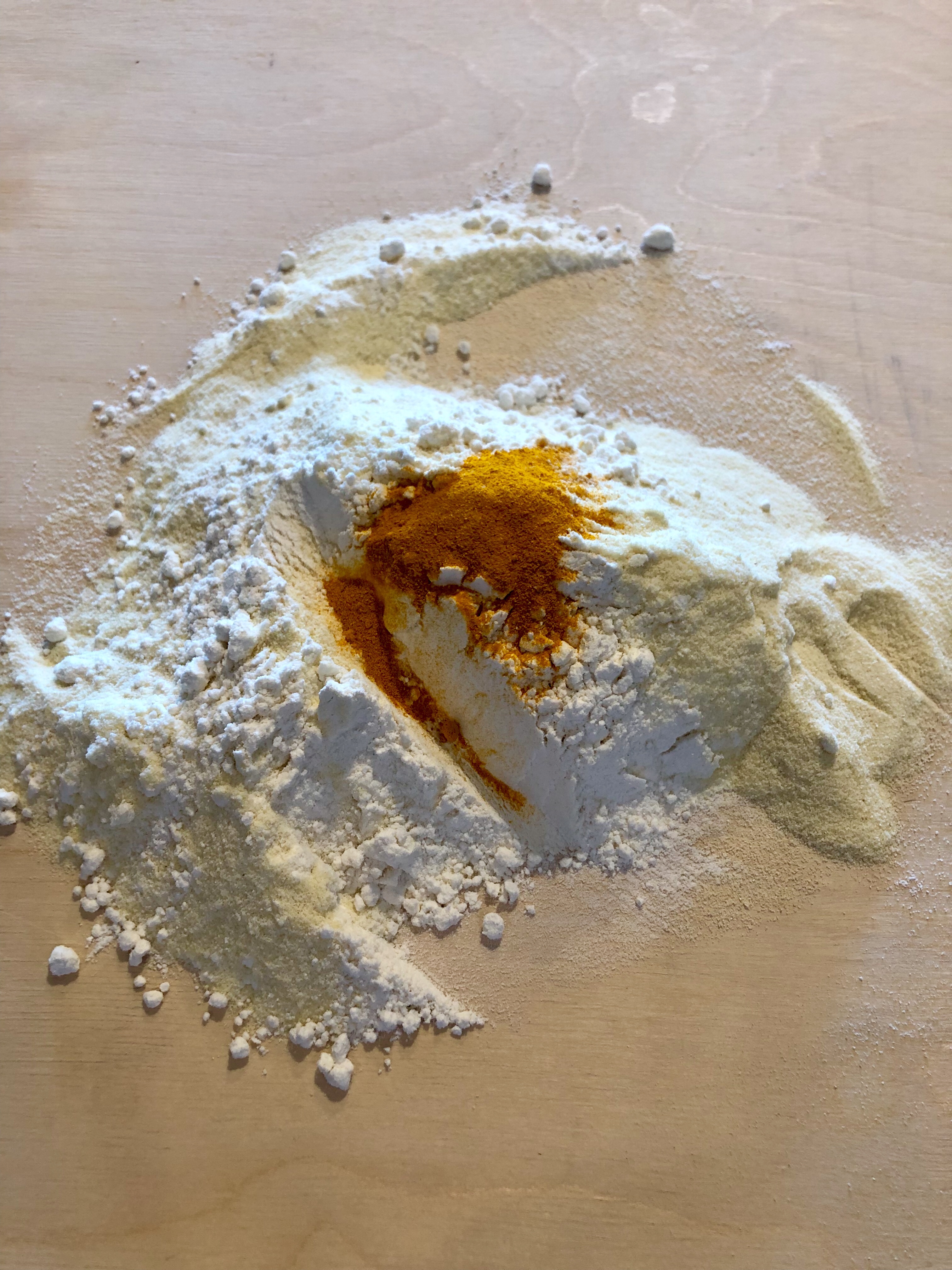 Sulla spianatoia mescolo le due farina e la curcuma