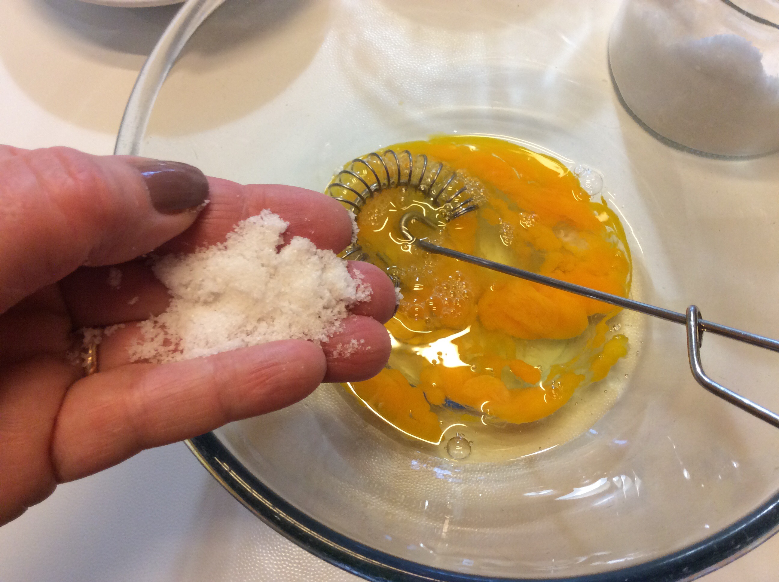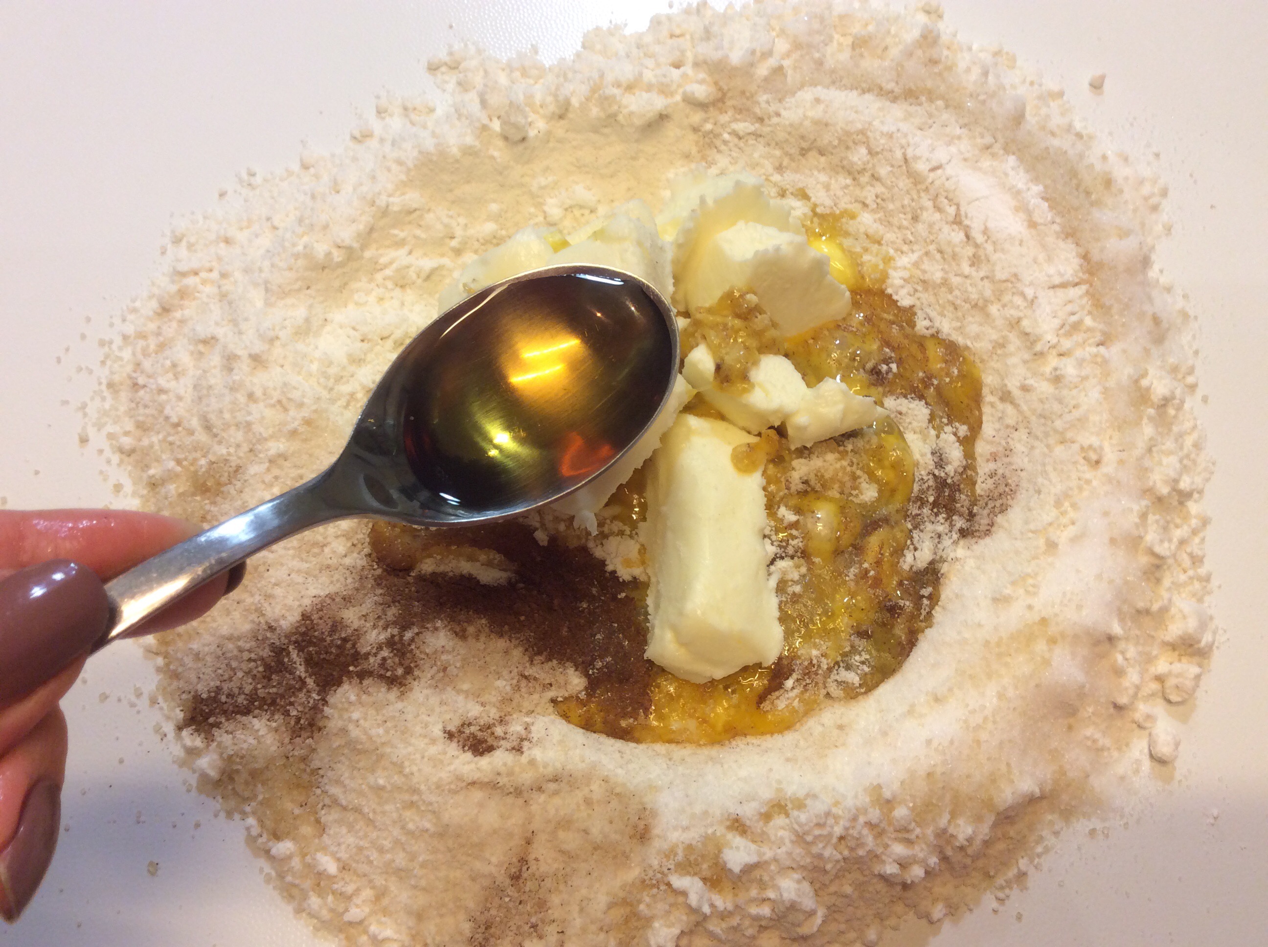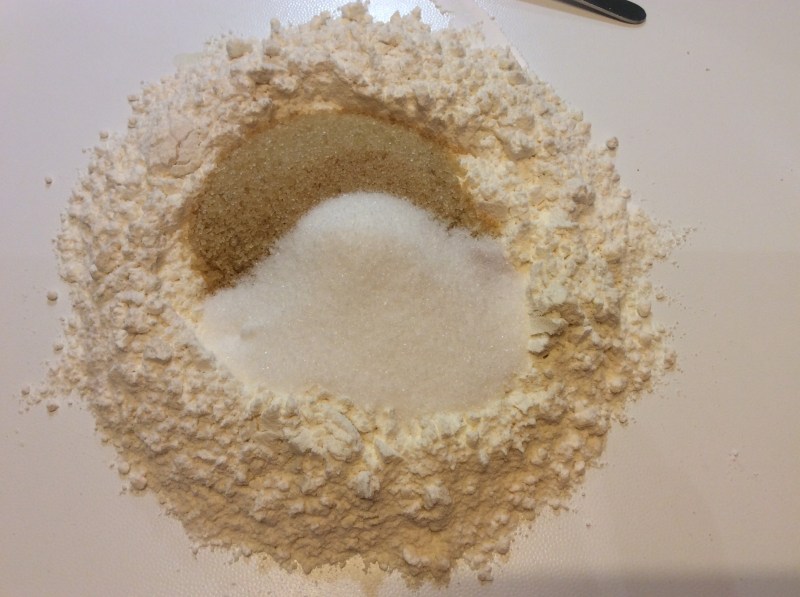 Sul piano di lavoro verso la farina e formo un incavo al centro, aggiungo il sale, l’albume e il burro sciolto o l’olio