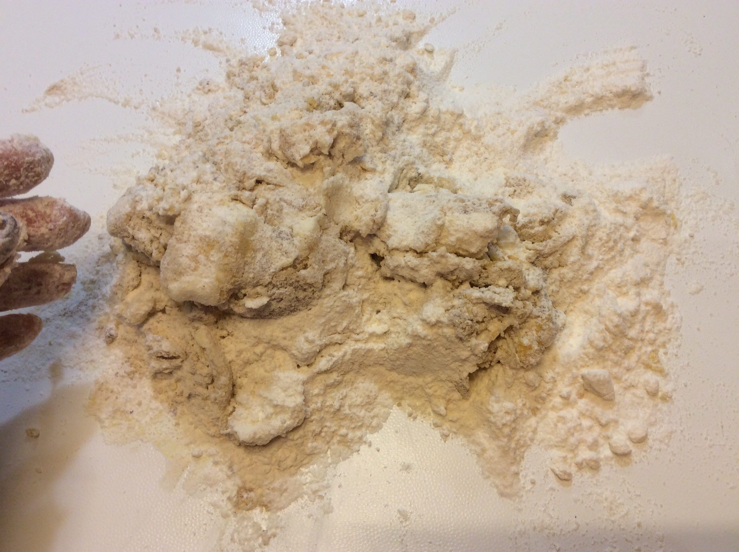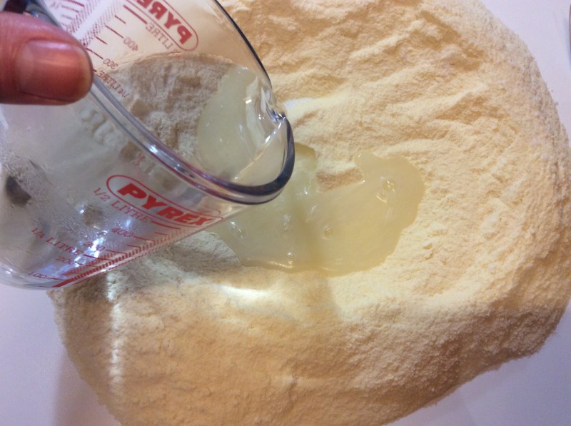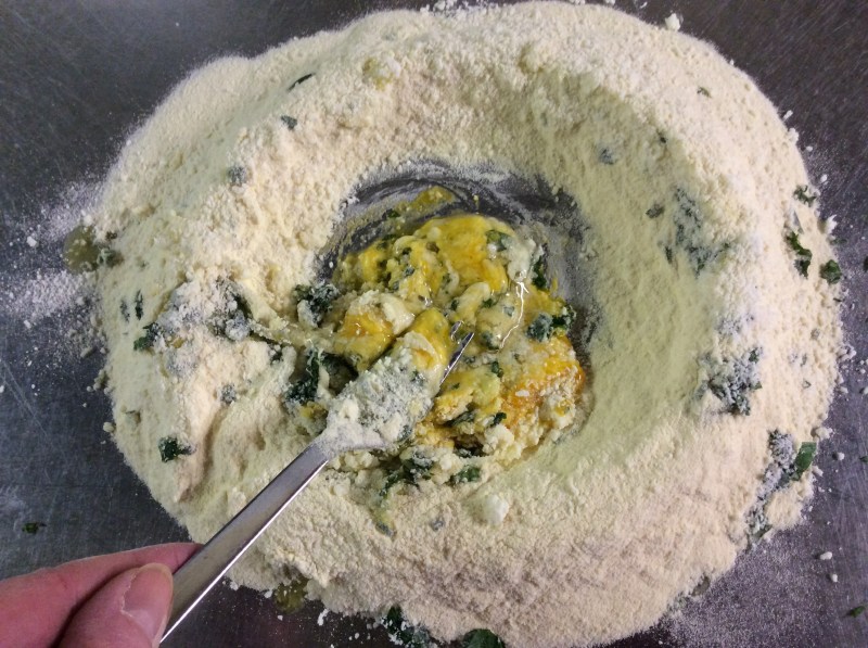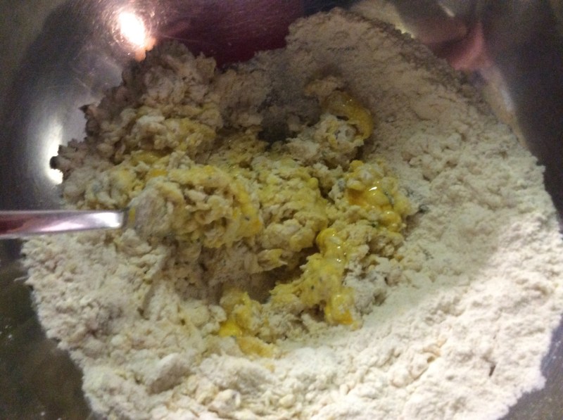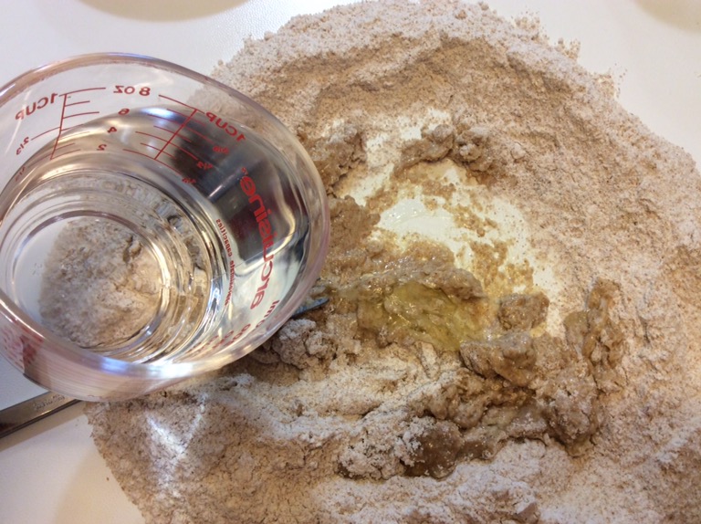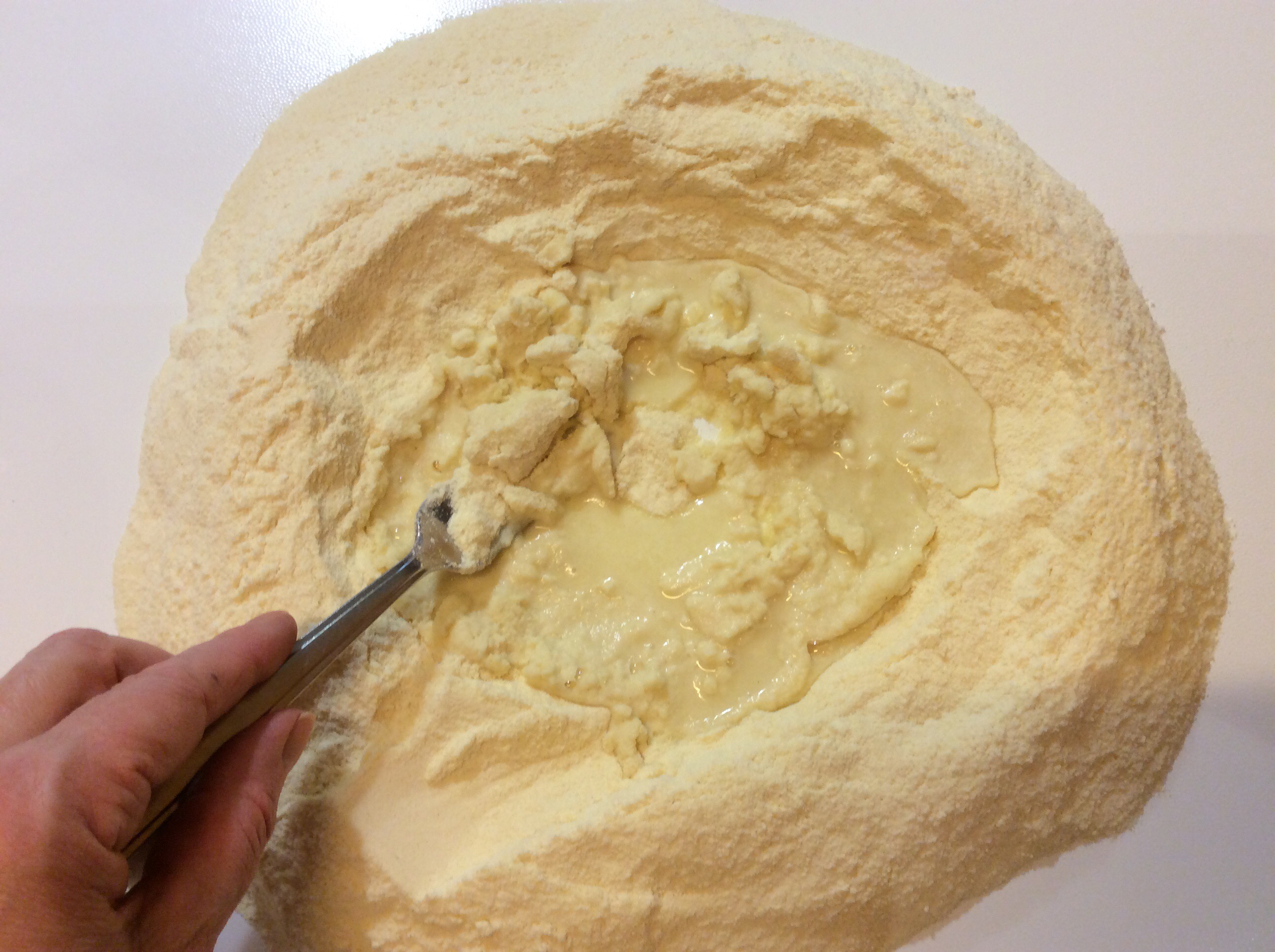 Inizio ad incorporarli alla farina con una forchetta, aggiungo poco per volta l’acqua