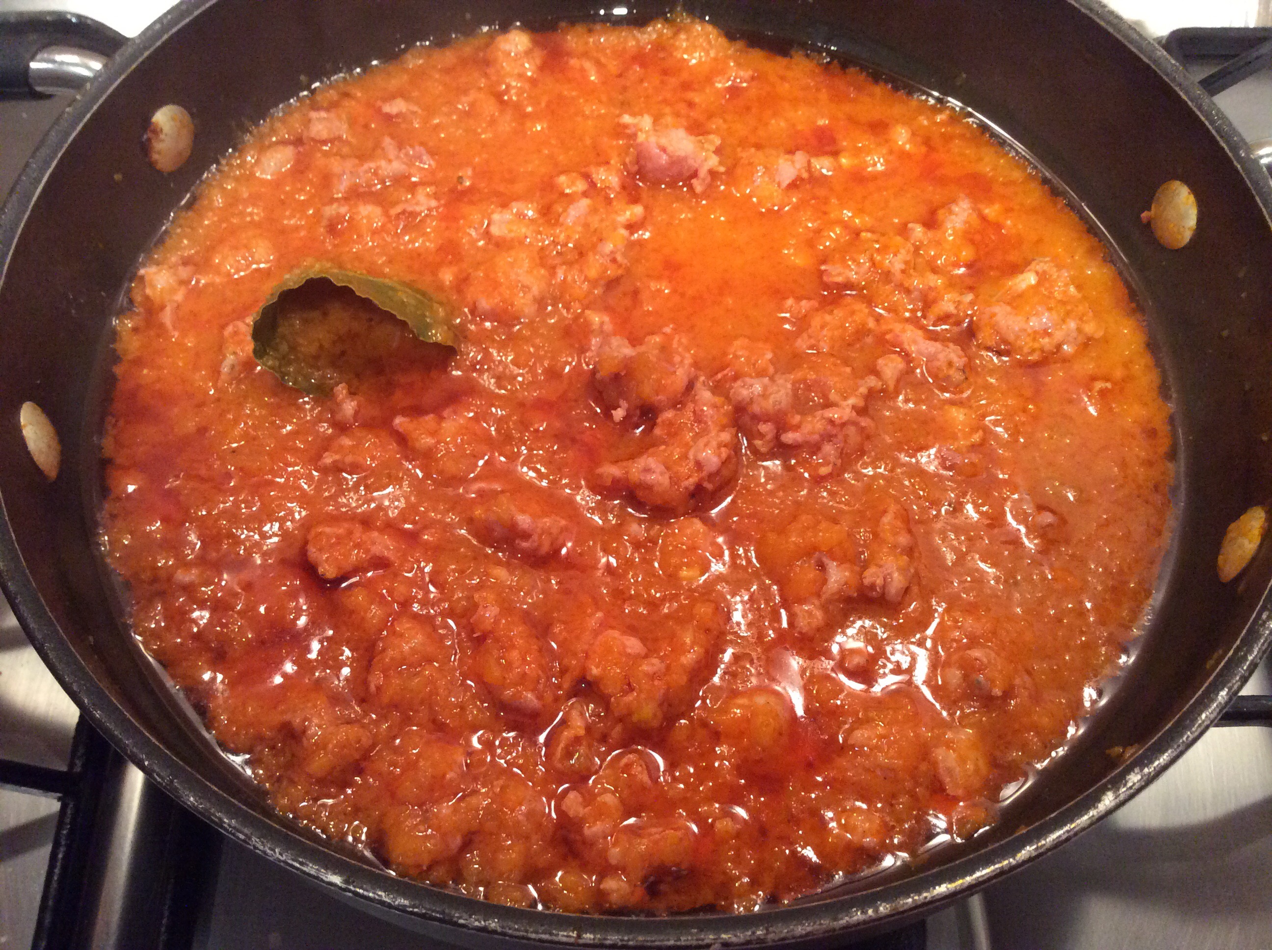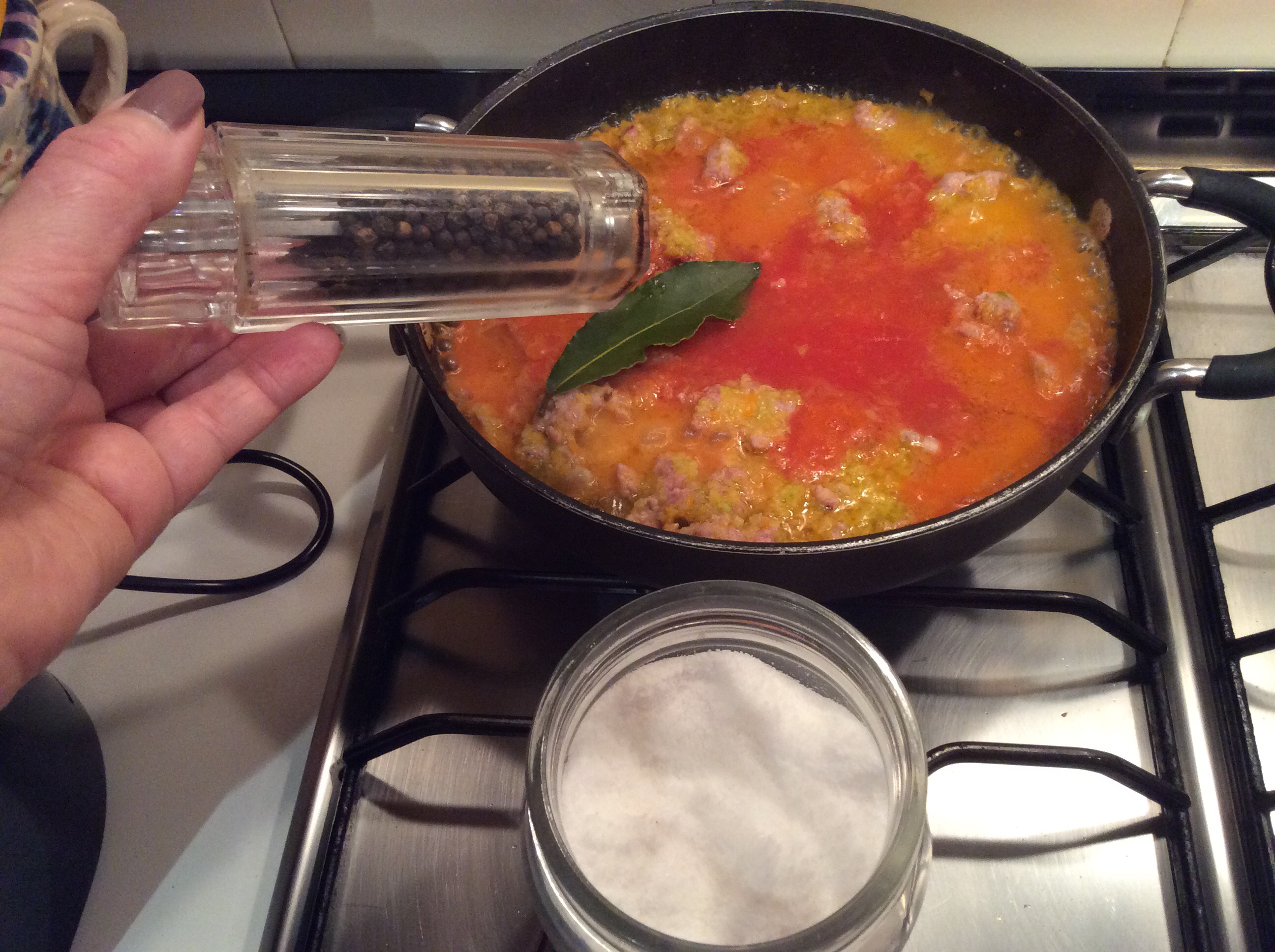 Diluisco il concentrato di pomodoro in un bicchiere di acqua, lo aggiungo al sugo, regolo di sale e pepe e unisco la foglia di alloro