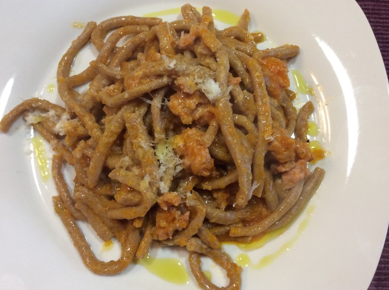 Pasta fatta in casa facile, un po’ laboriosa ma vi ripagherà della fatica, il “pestōm” è l’impasto del salame, un sugo ricco e avvolgente dal sapore deciso, un ottimo anche per altri tipi di pasta o gnocchi, questa è una vecchia ricetta, prevede anche il burro che potete sostituire con l’olio extravergine e ha gli albumi, gli intolleranti possono eliminarli aggiungendo acqua