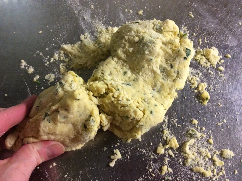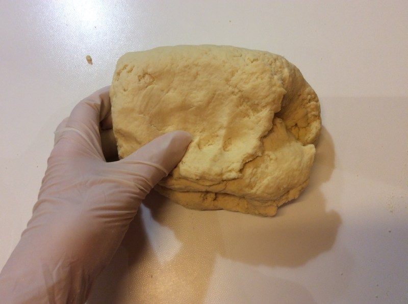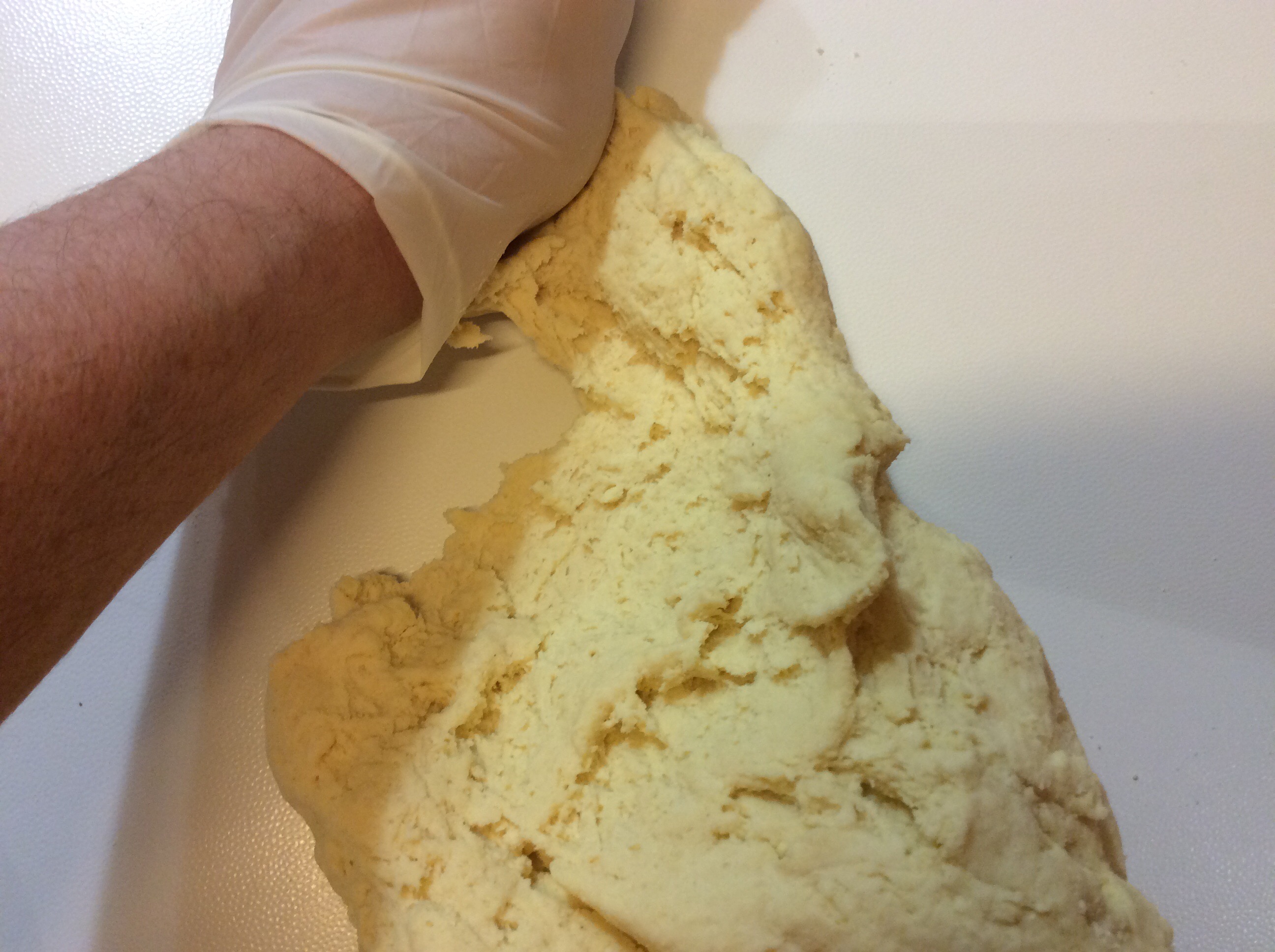 Devo ottenere un impasto legato, malleabile ma sodo, lo lavoro per una decina di minuti tirandolo e riavvolgendolo in modo che diventi liscio ed elastico e non appiccicoso