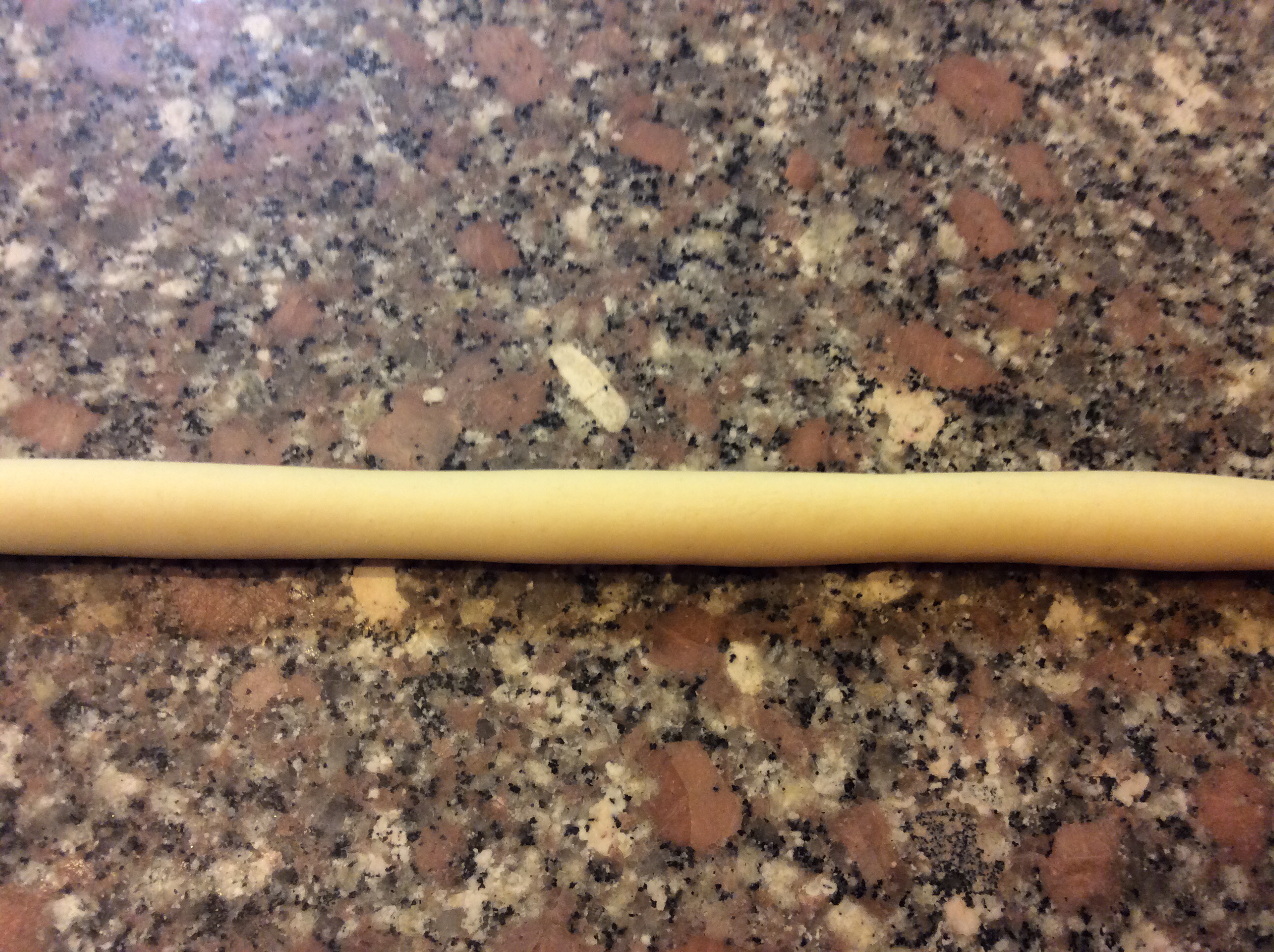 Non infarinate il piano di lavoro altrimenti non riuscirete arrotolarli, se avete un tappetino di silicone sarà perfetto, appoggio la strisciolina e la arrotolo con le due mani fino ad ottenere uno spaghettone, siate leggeri con le mani sarà più facile arrotolarli