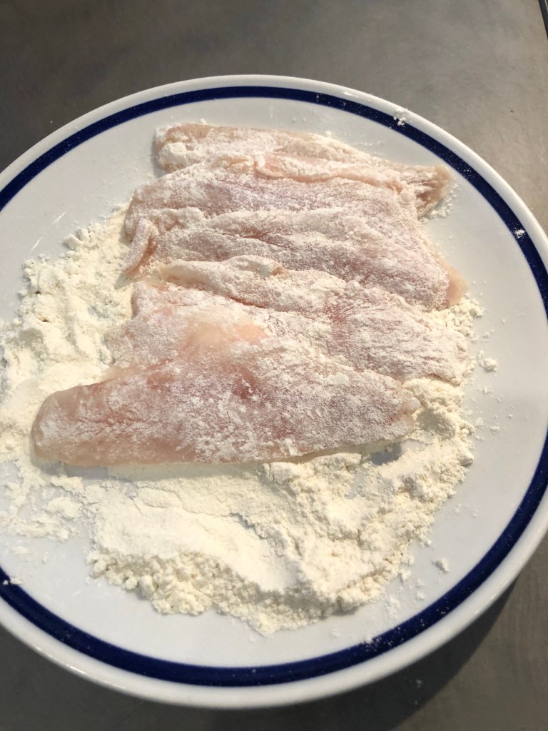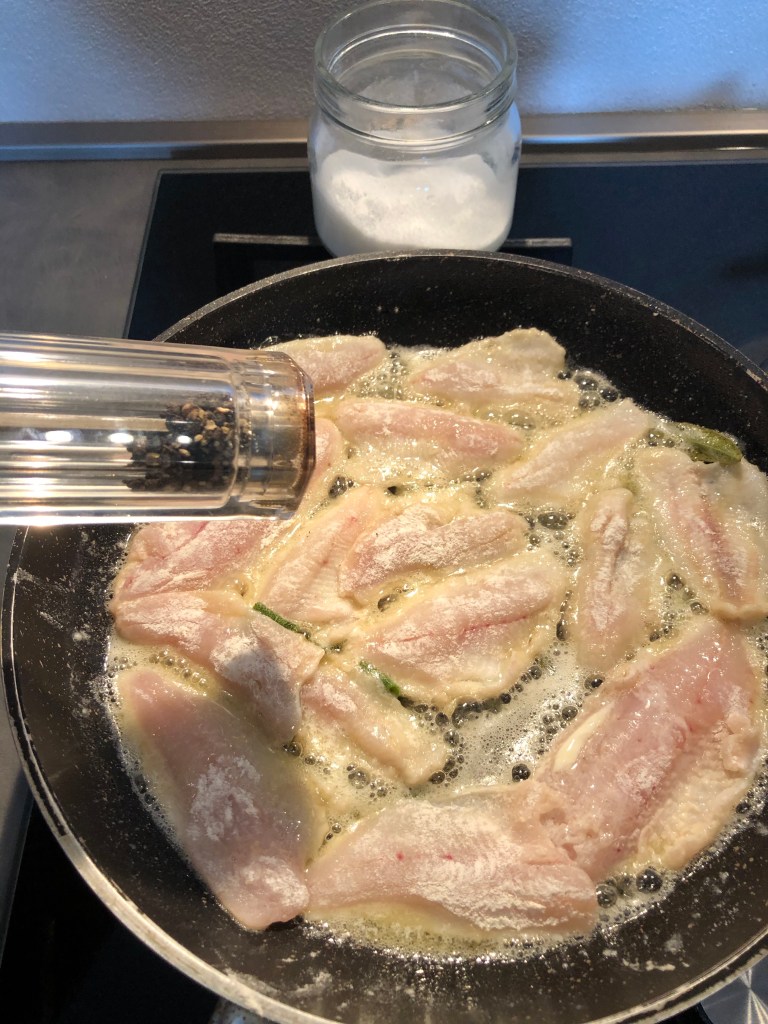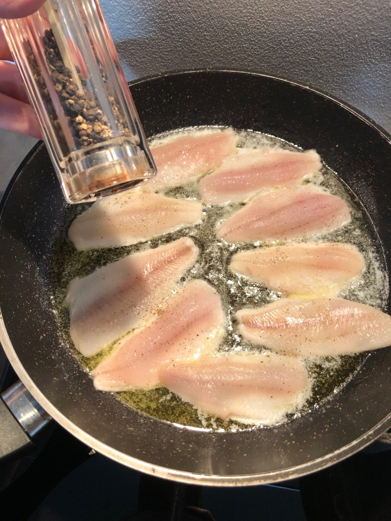 Elimino tutte le lische dal filetto di trota lascio la pelle e lo cuocio in una padella con pochissimo olio, aggiungo sale e pepe