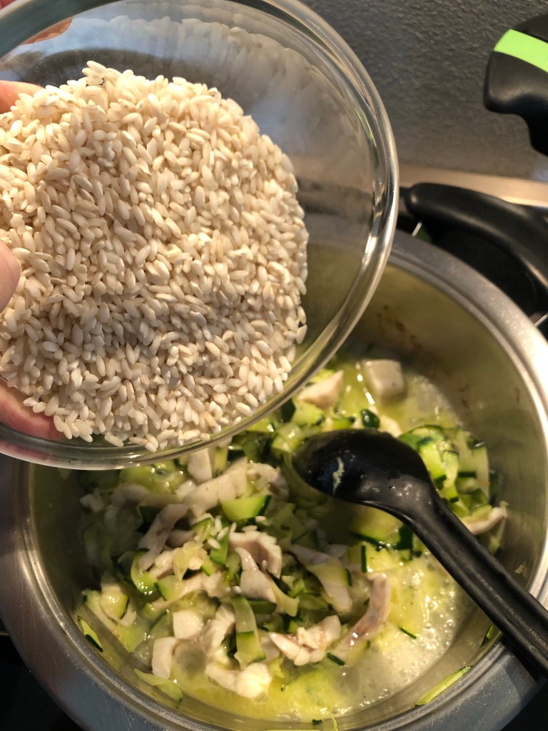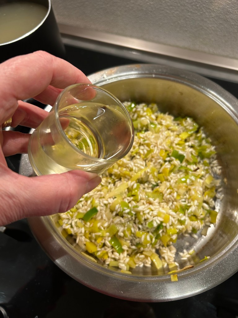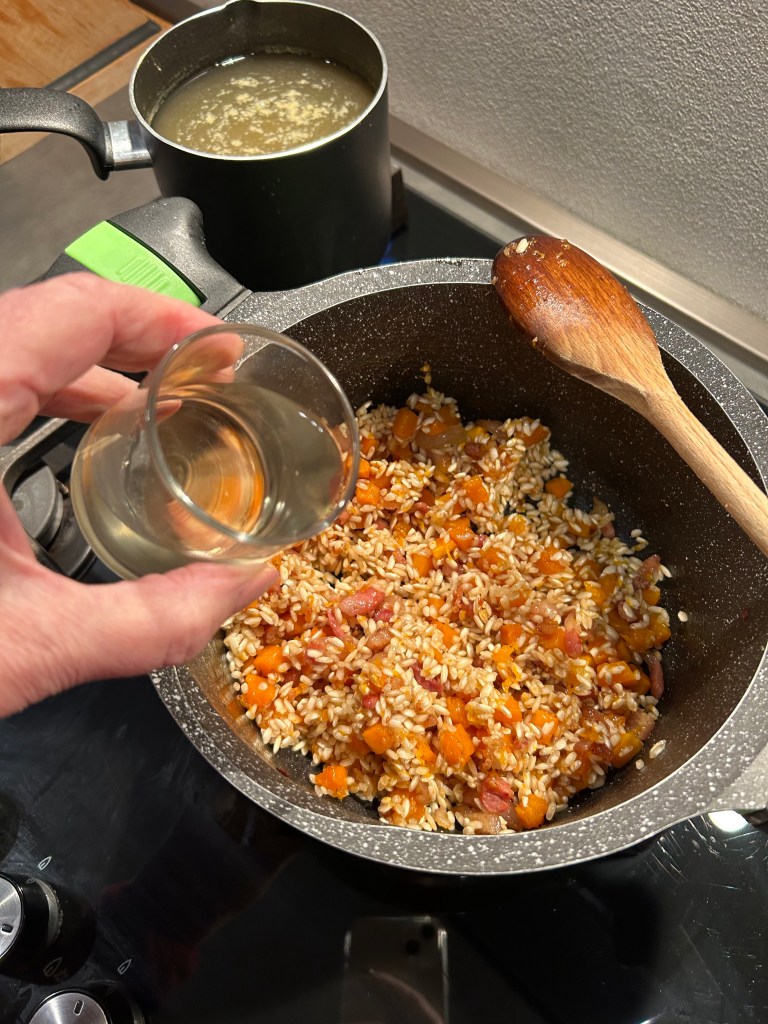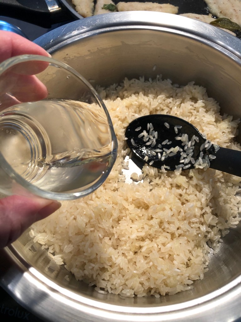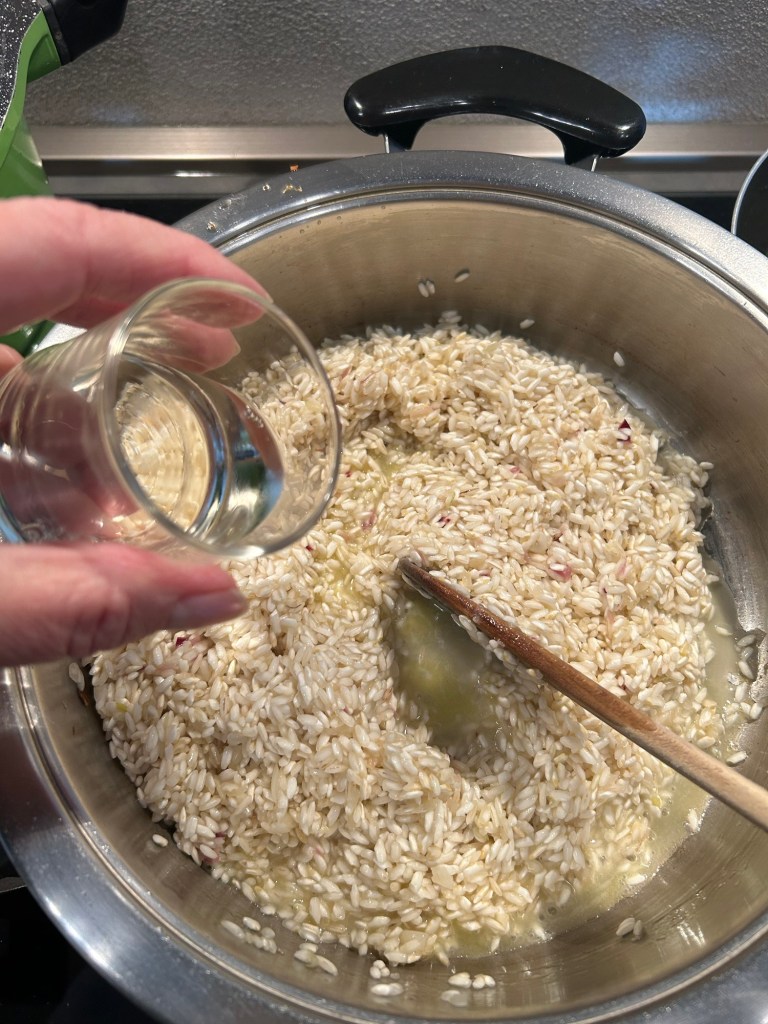 Aggiungo il riso e lascio tostare, quando toccandolo risulta caldo sfumo con il vino bianco