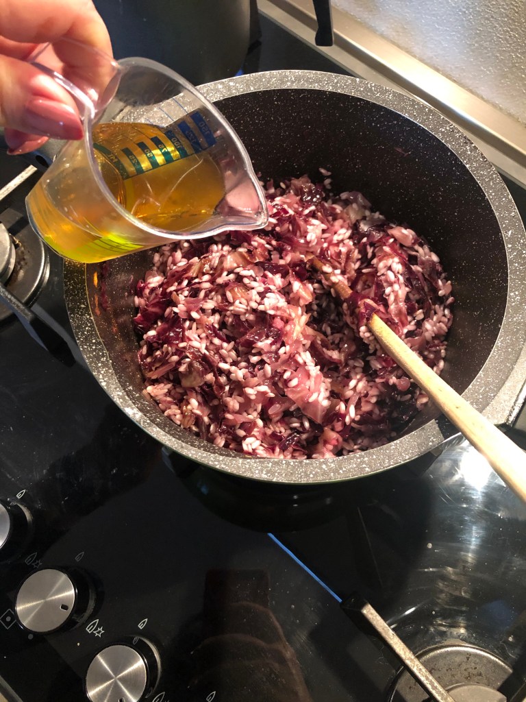 Quando é sfumato aggiungo poco per volta il brodo vegetale che nel frattempo ho portato a bollore, continuo a mescolare e porto a cottura