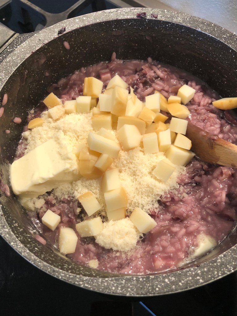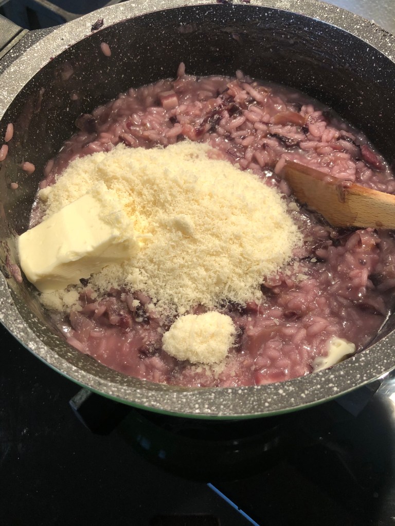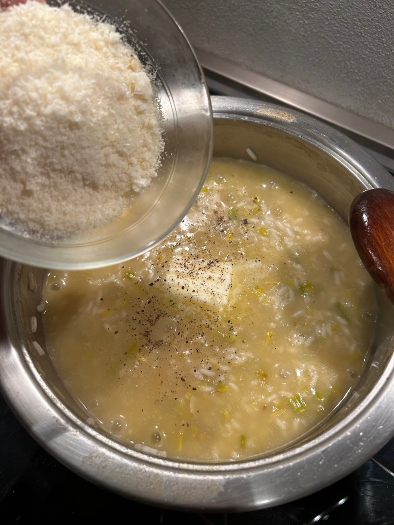Dopo 15 minuti, il risotto è pronto, morbido all’onda, tolgo dal fuoco, aggiungo il burro, il parmigiano, una macinata di pepe e manteco energicamente muovendo la padella avanti e indietro, in questo modo il riso rilascerà l’amido creando una crema densa e vellutata