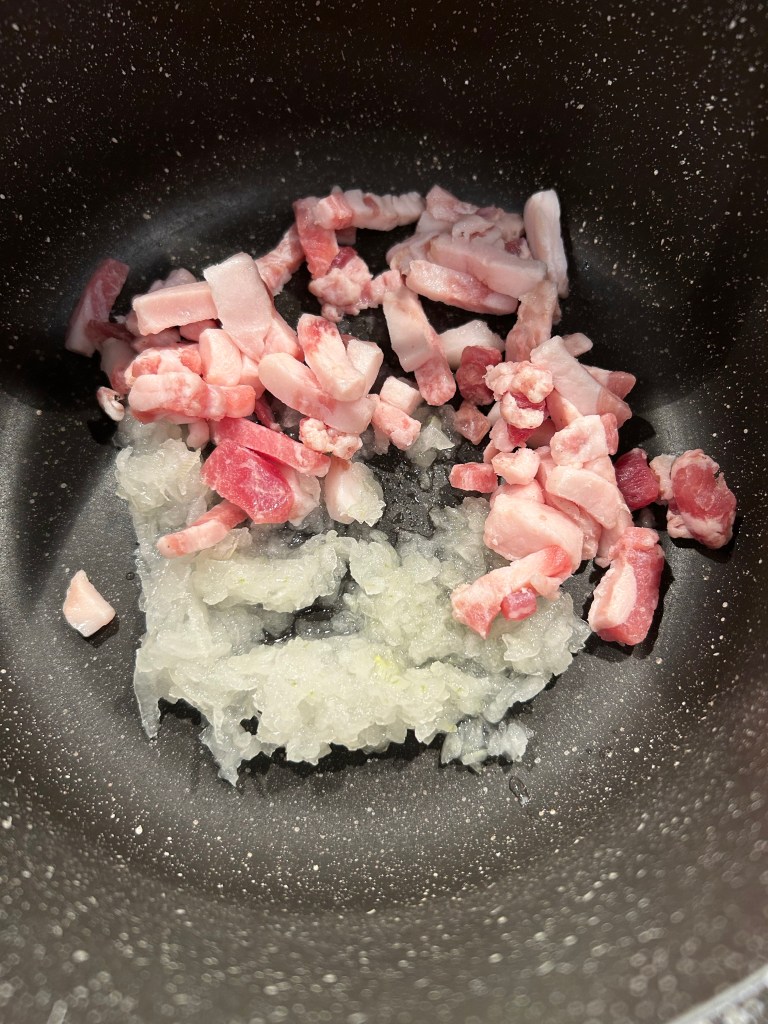 In una larga pentola verso la cipolla tritata un goccio di olio e 30 gr di burro