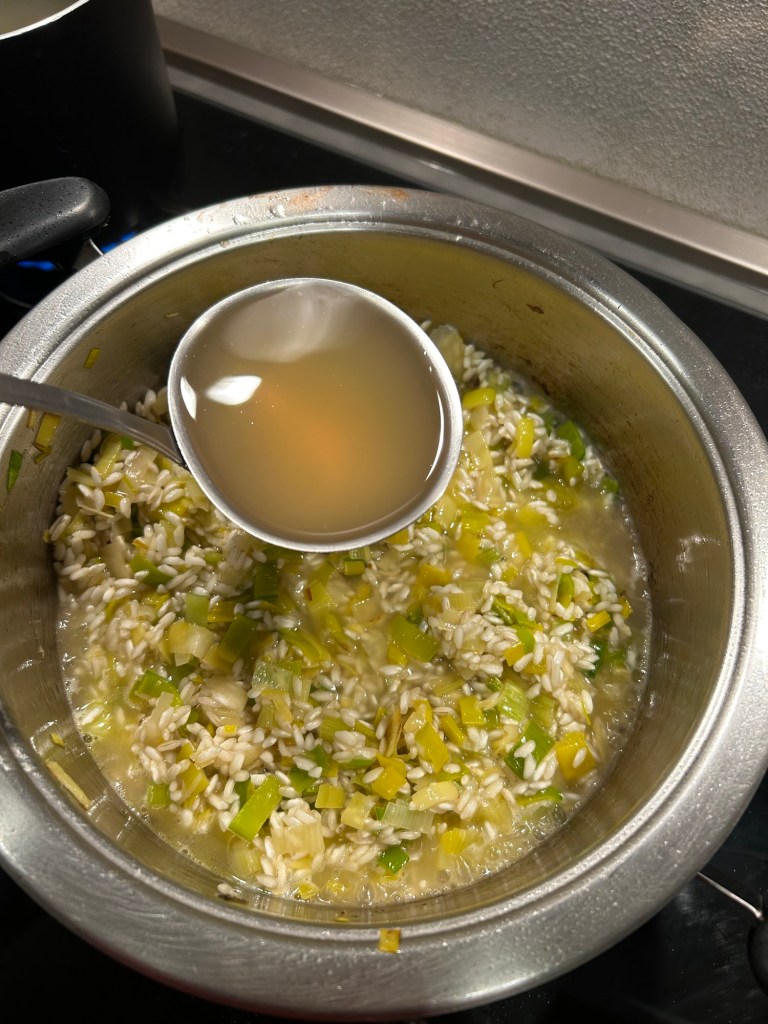 Inizio ad aggiungere il brodo vegetale bollente, ricoprendo il riso poi sempre mescolando lo aggiungo poco per volta e porto a cottura, regolo di sale