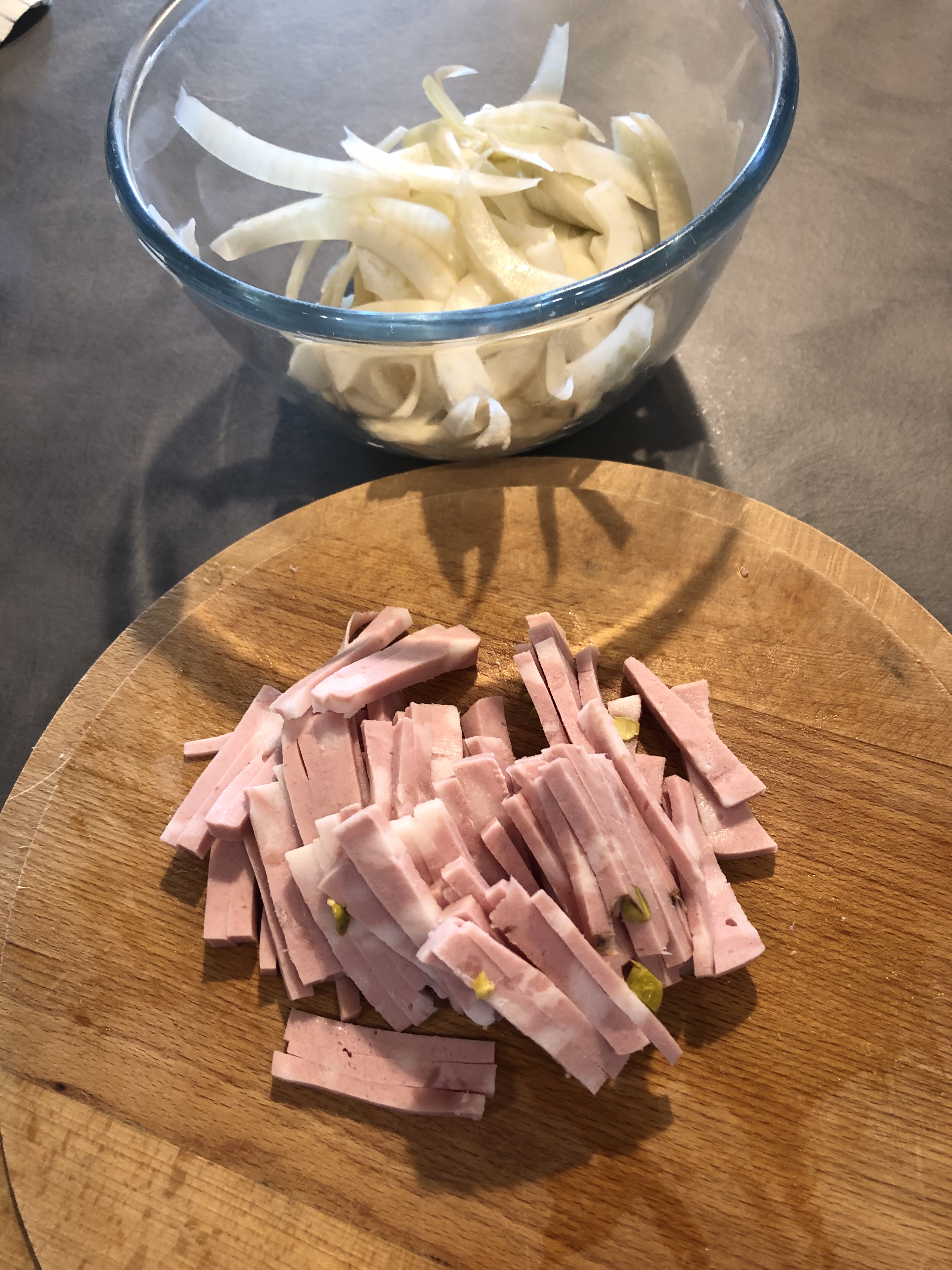 Taglio la mortadella a striscioline e il finocchio sottile con una mandolina