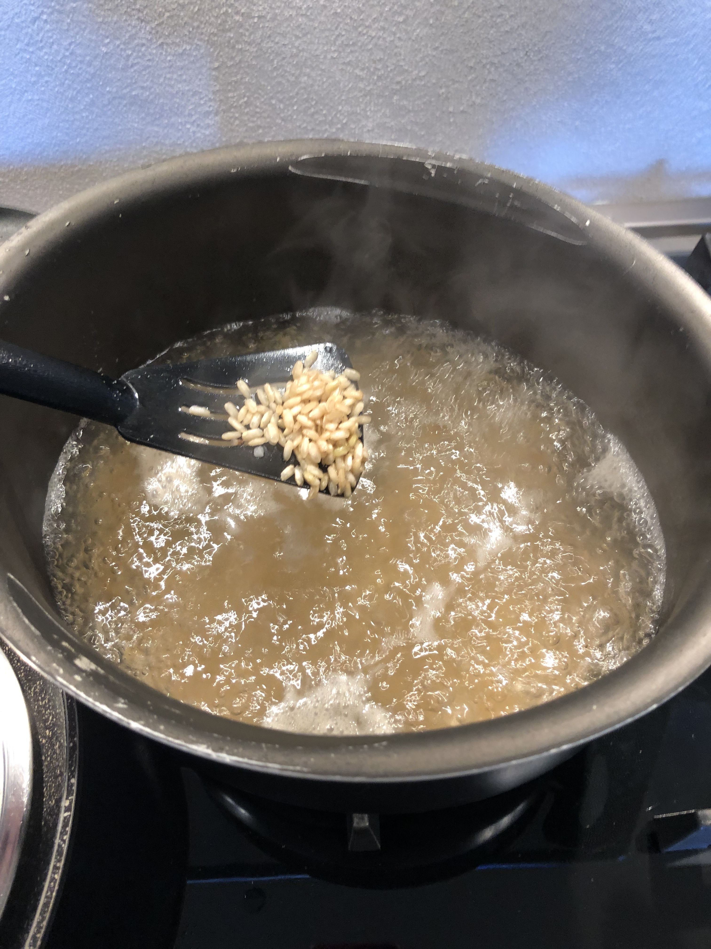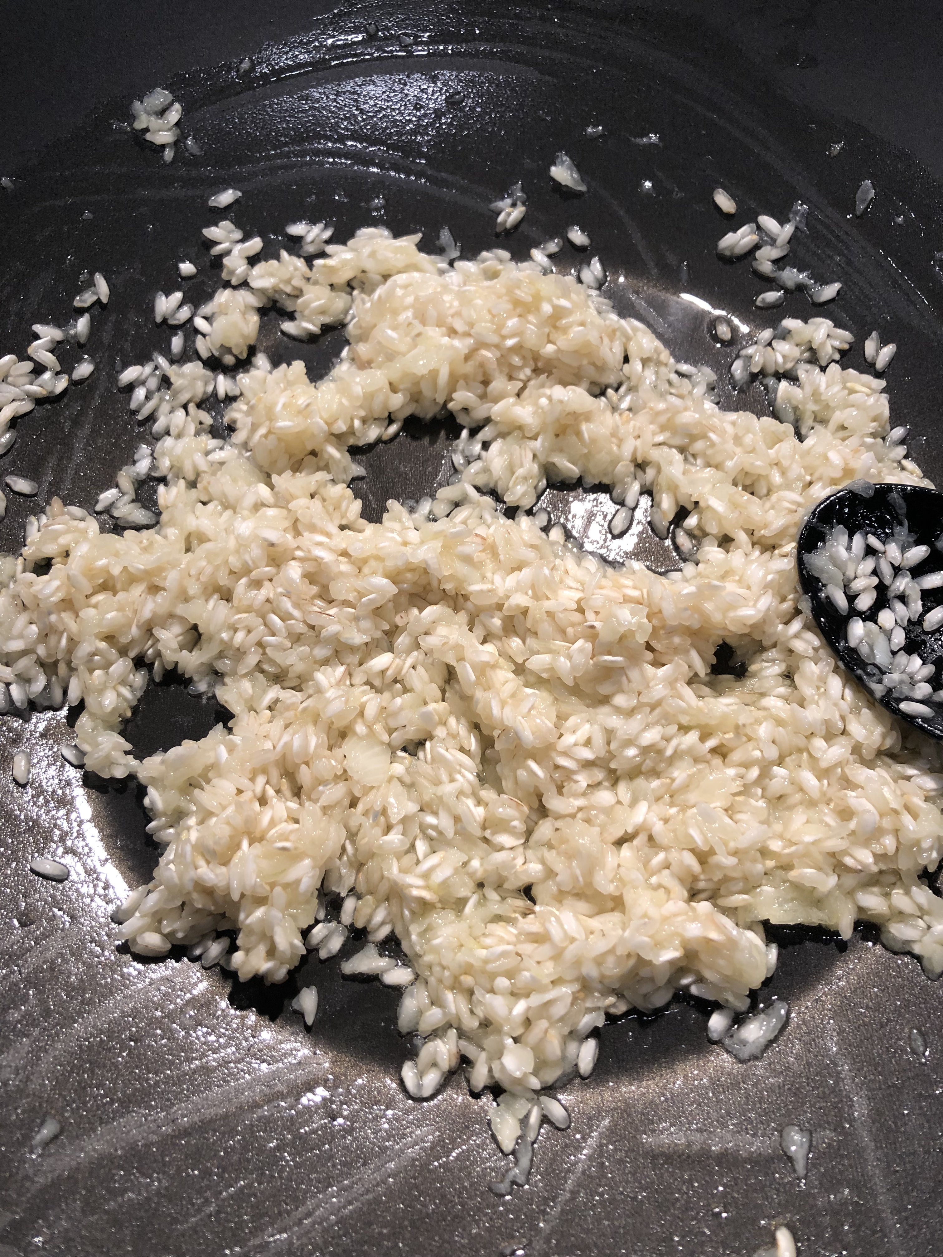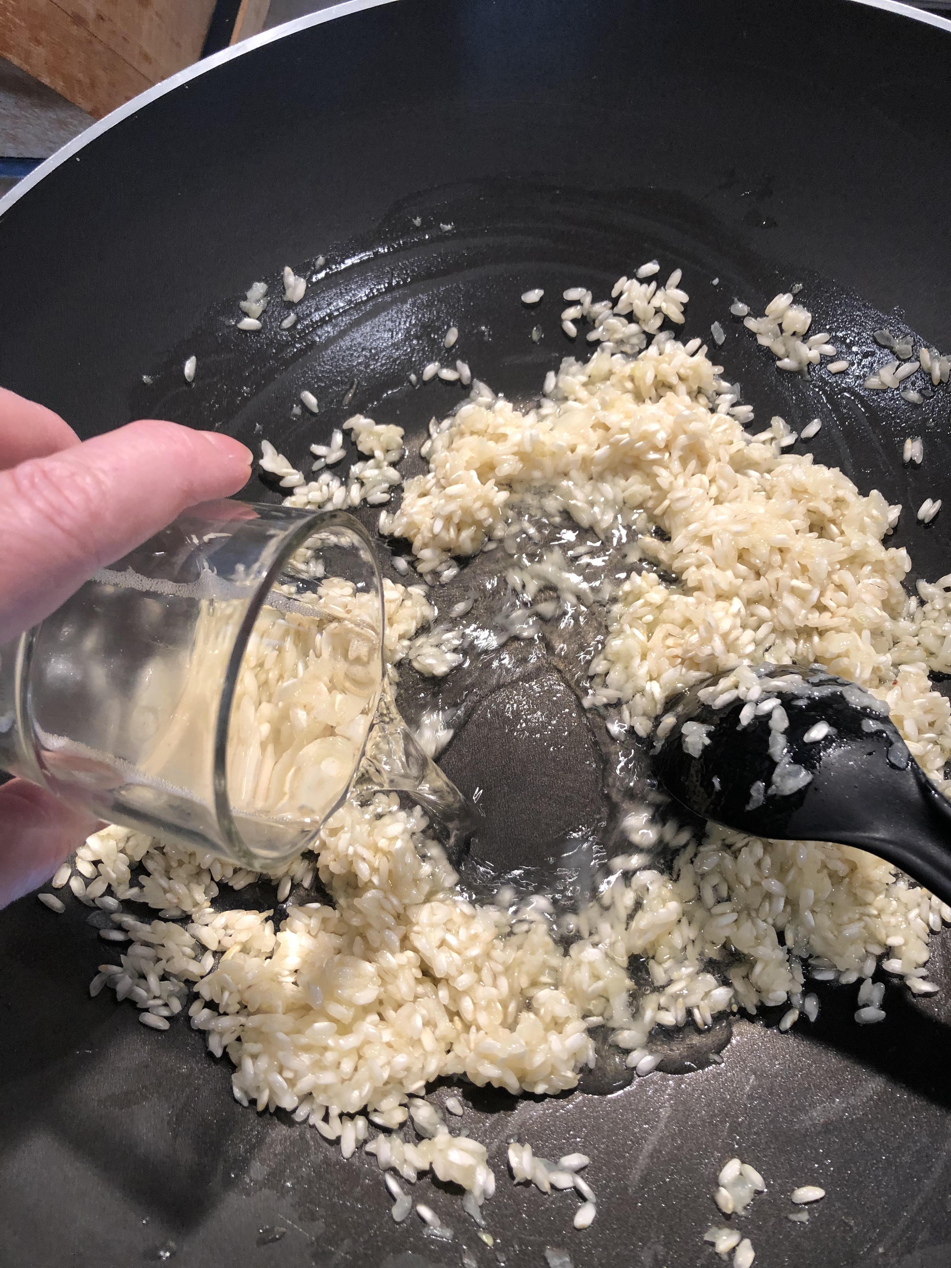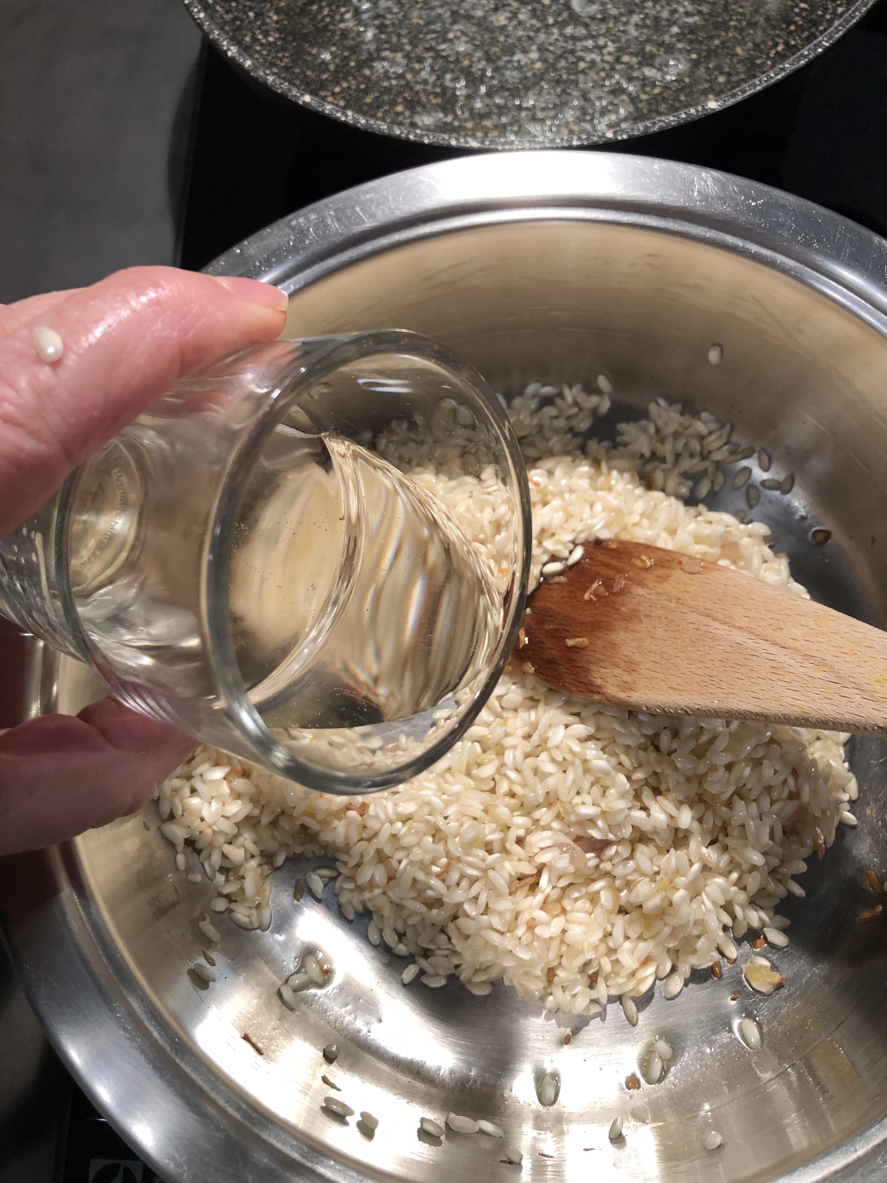 Aggiungo il riso e lascio tostare, quando toccandolo risulta caldo sfumo con il vino bianco