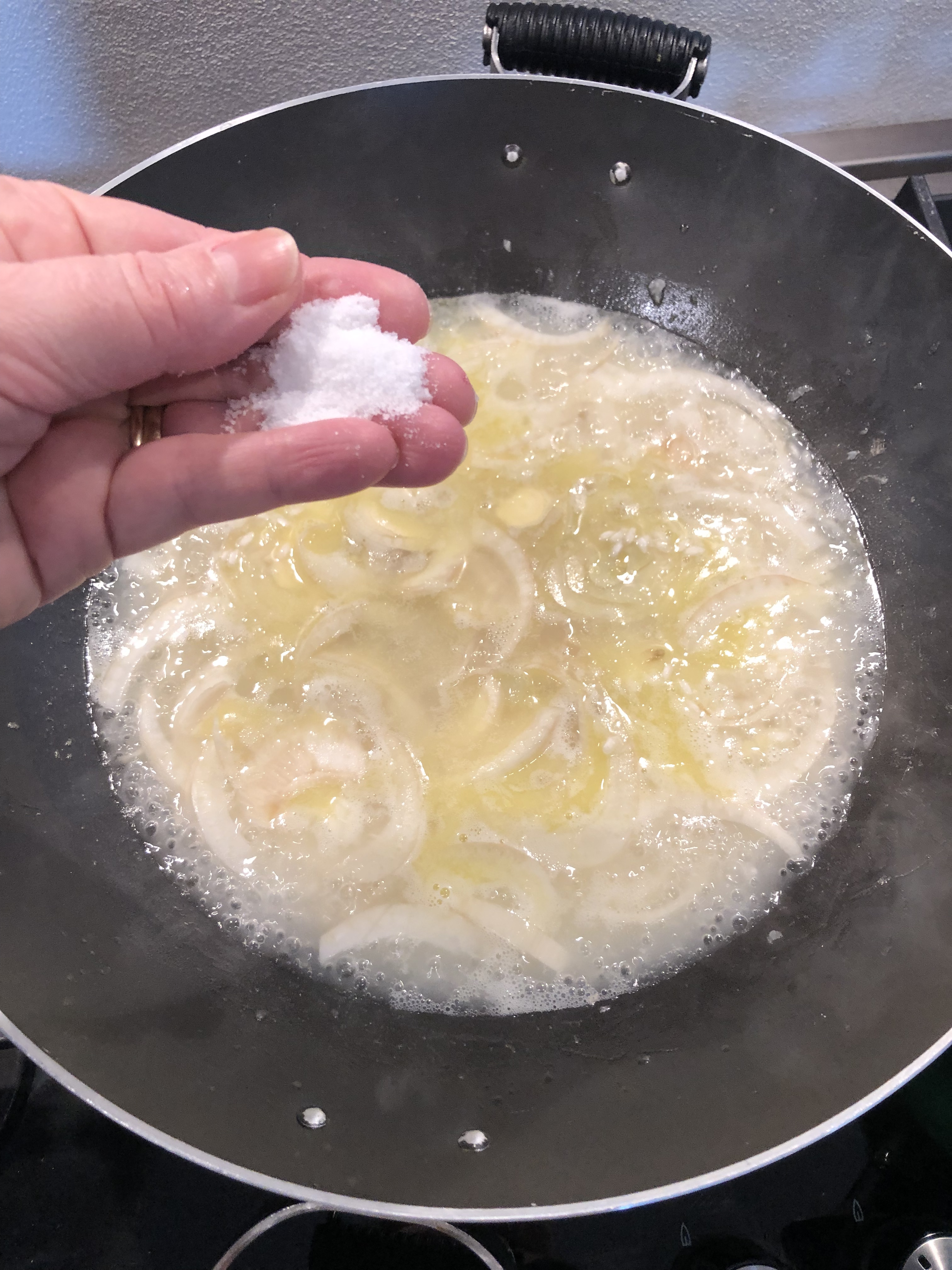 Lo metto in una padella con abbondante olio e lascio cuocere dolcemente aggiungendo se serve un po’ di brodo vegetale, deve risultare morbido, aggiungo poco sale