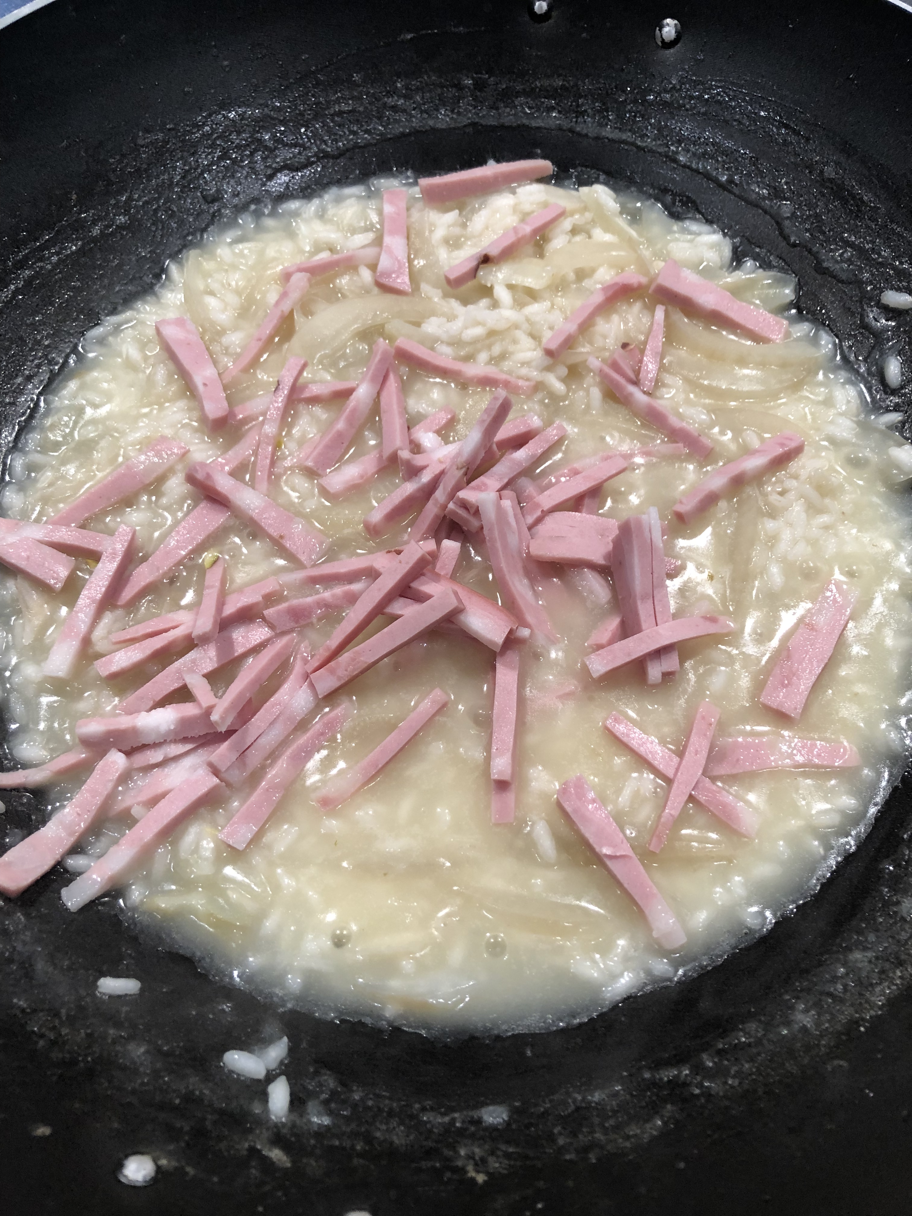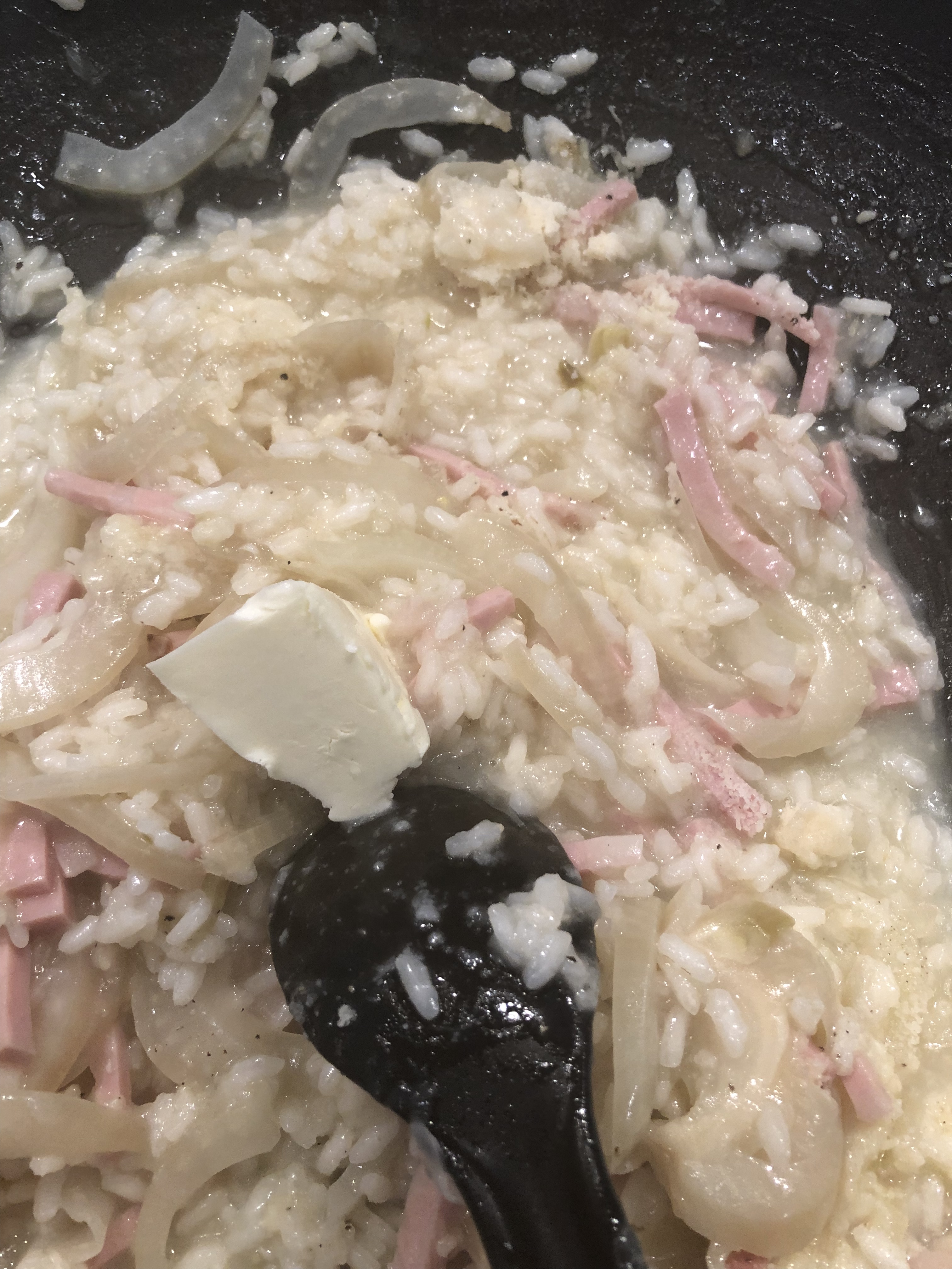 Quando il riso é cotto, mi raccomando al dente, aggiungo la mortadella e spengo il gas