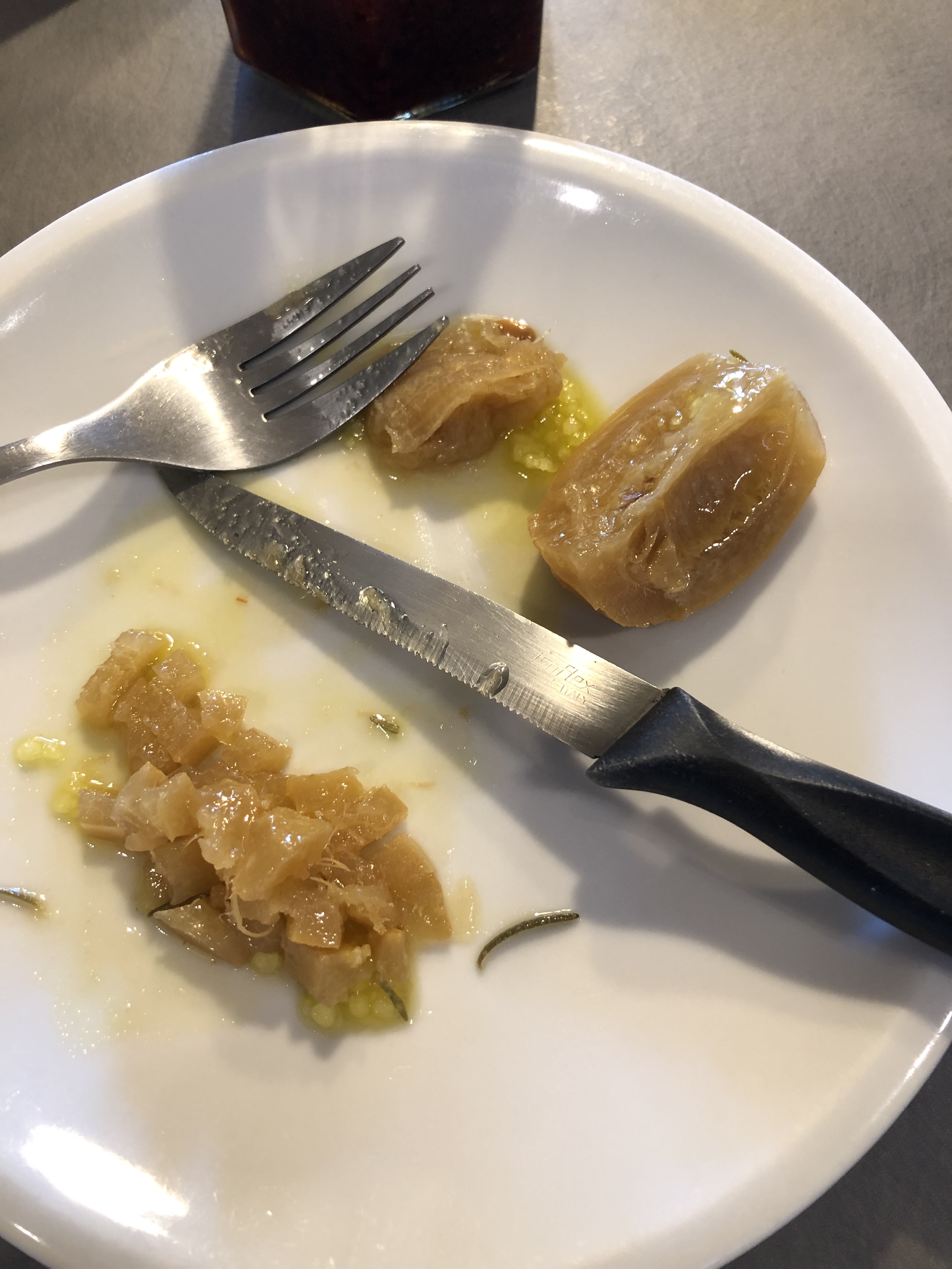 Taglio a cubetti il limone, se proprio non lo trovate grattugiate la buccia di un limone e mescolatela con un po’ di olio e tenete da parte