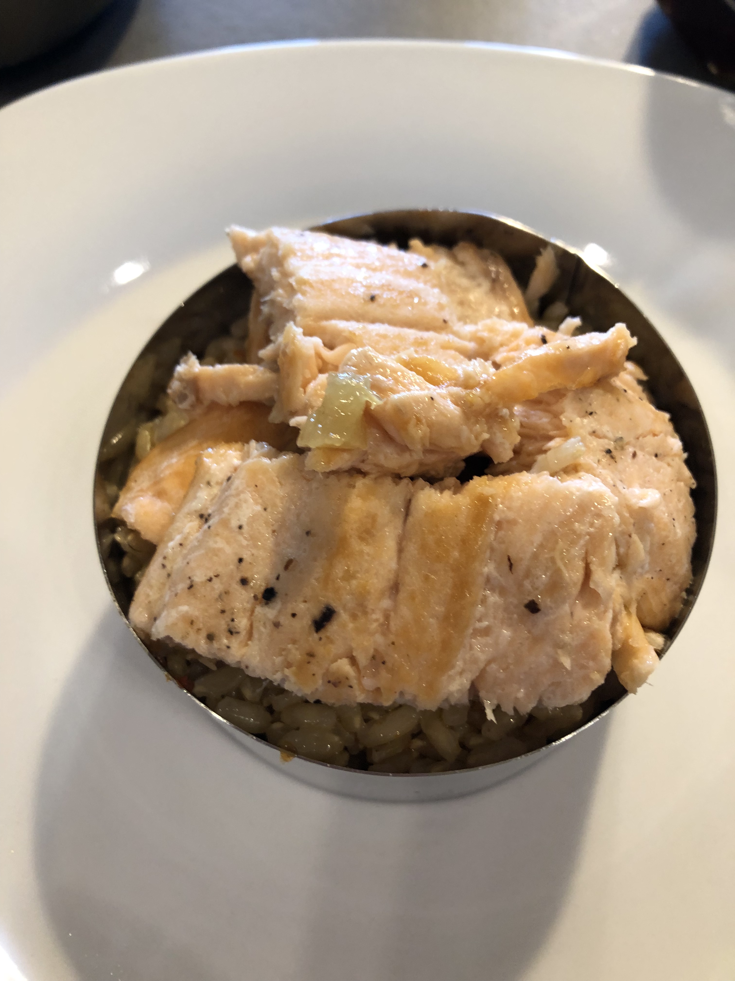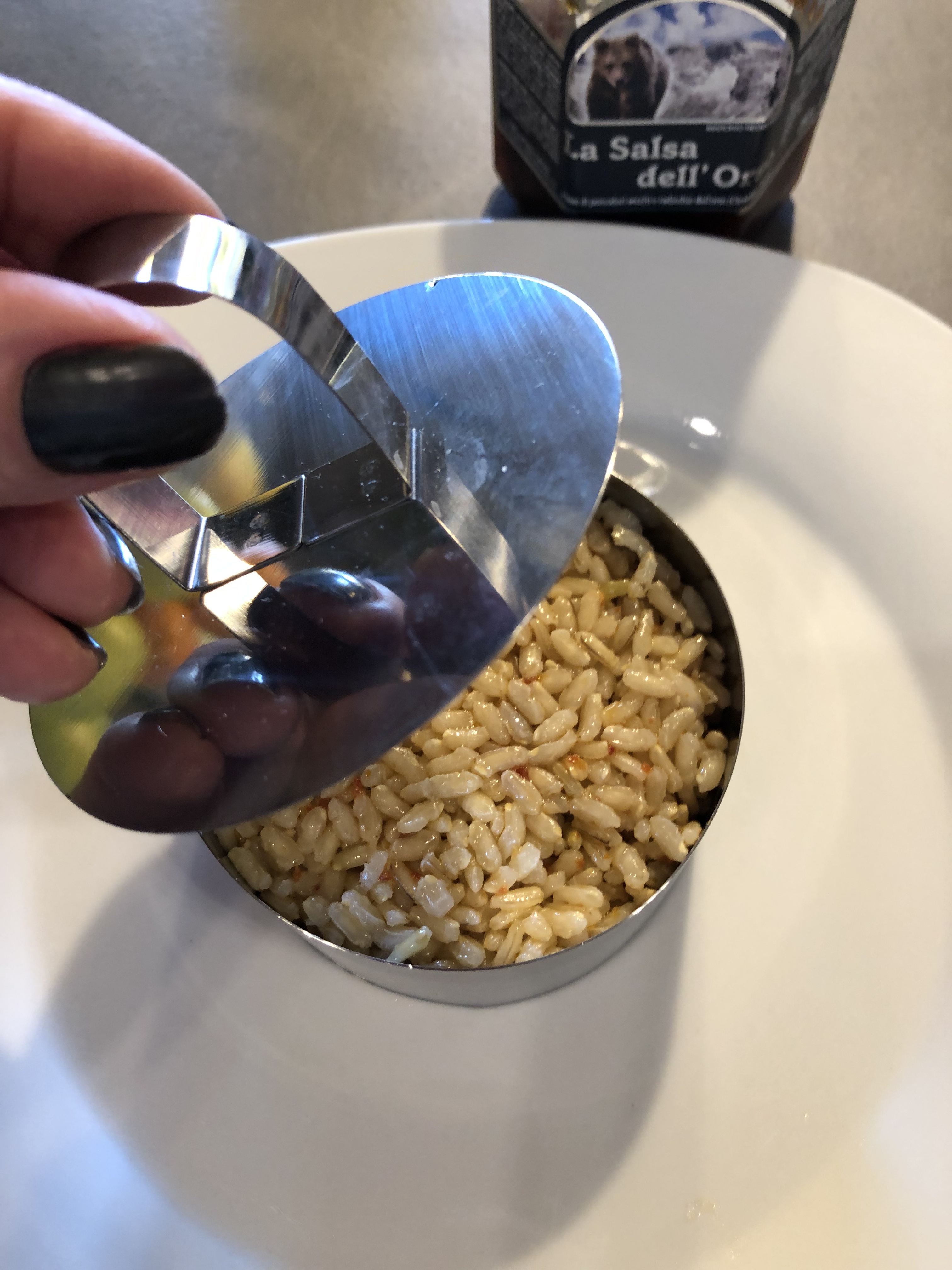 Suddivido il riso in due coppa pasta di 10 cm di diametro pressandolo un po’