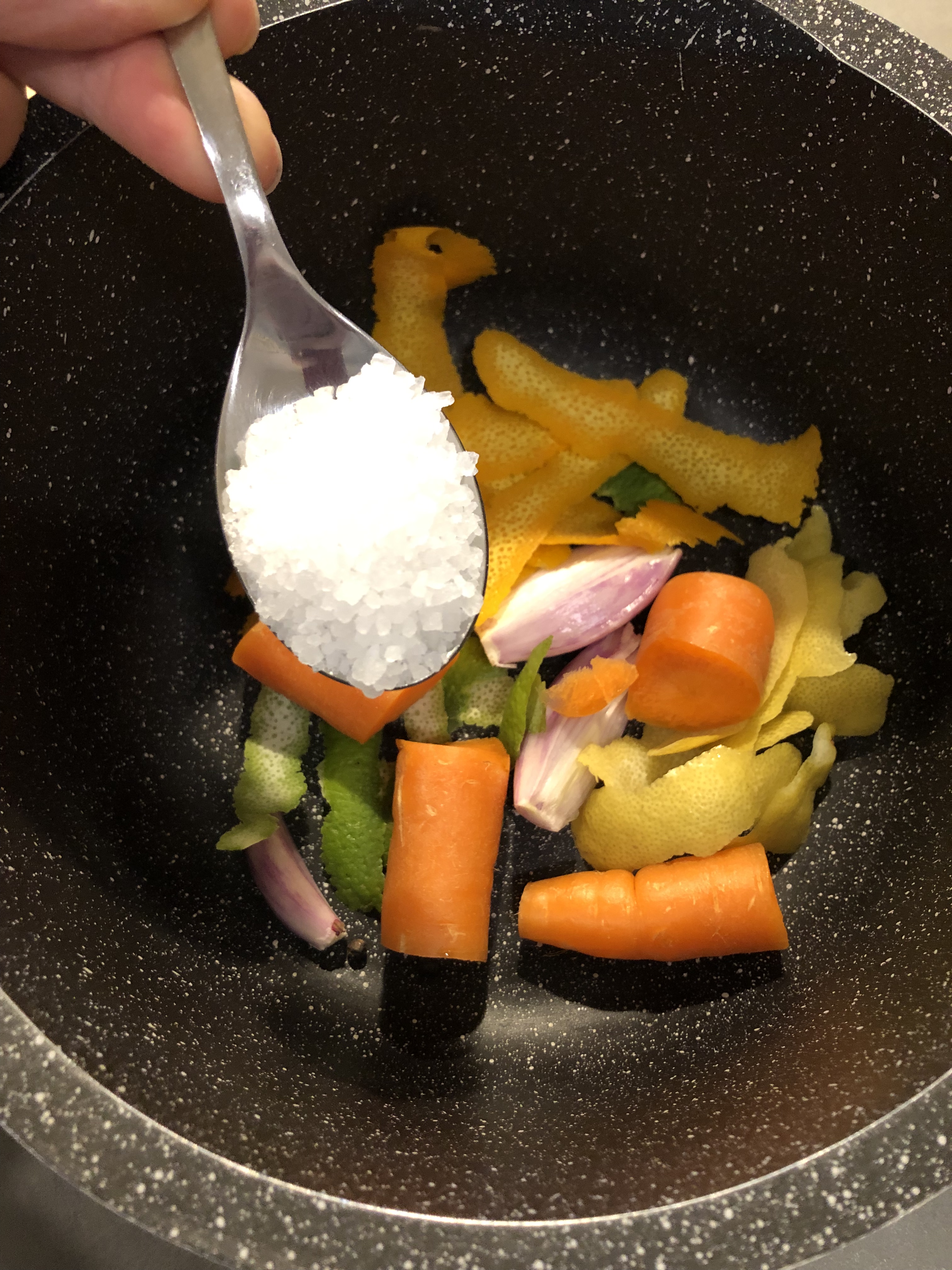 In una padella aggiungo le scorze degli agrumi, lo scalogno, la carota a pezzi, un cucchiaio di sale e i granì di pepe