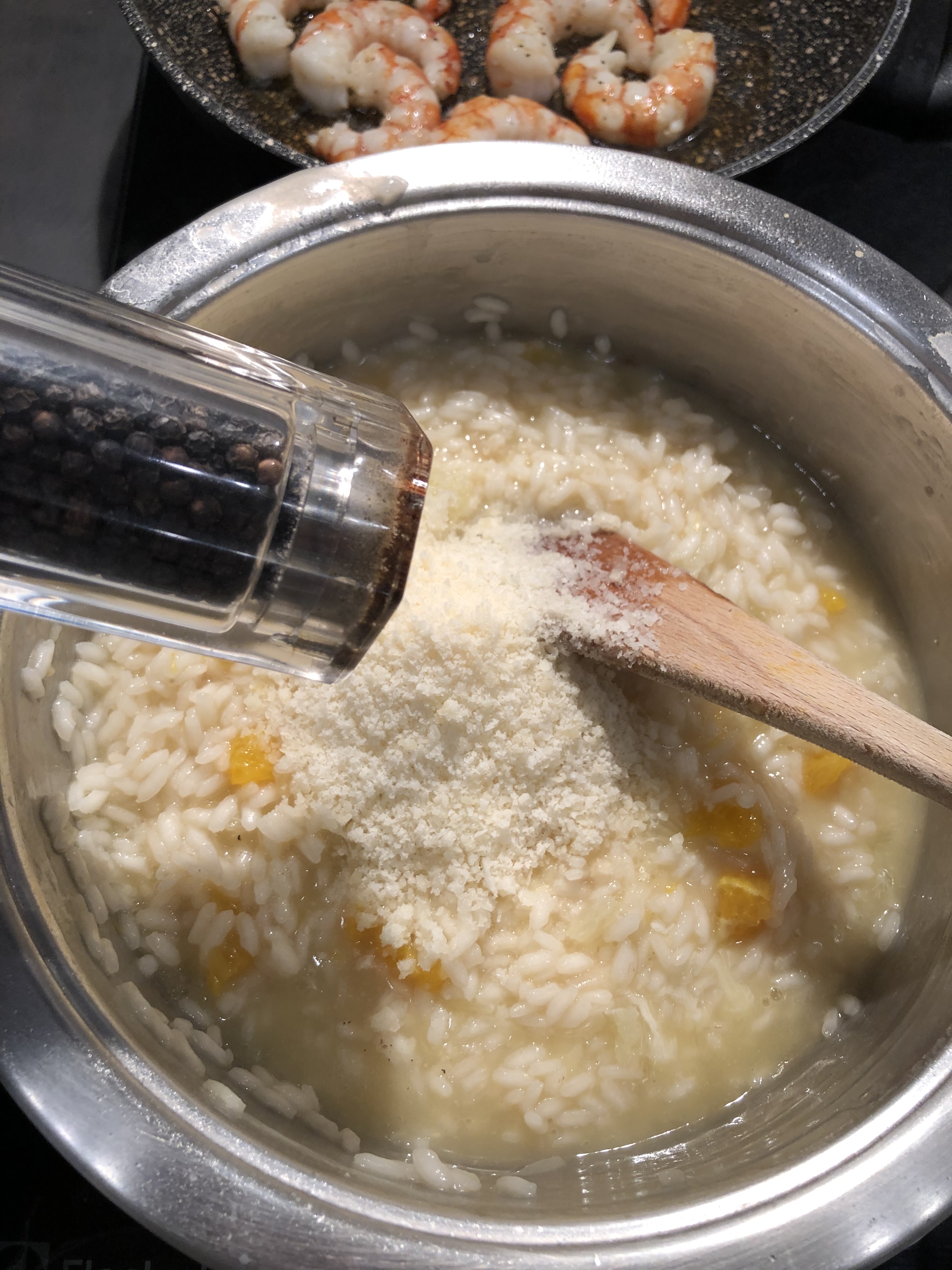 Dopo 15 minuti, il risotto è pronto, morbido all’onda, tolgo dal fuoco, aggiungo il burro, il parmigiano, una macinata di pepe e manteco energicamente muovendo la padella avanti e indietro, in questo modo il riso rilascerà l’amido creando una crema densa e vellutata