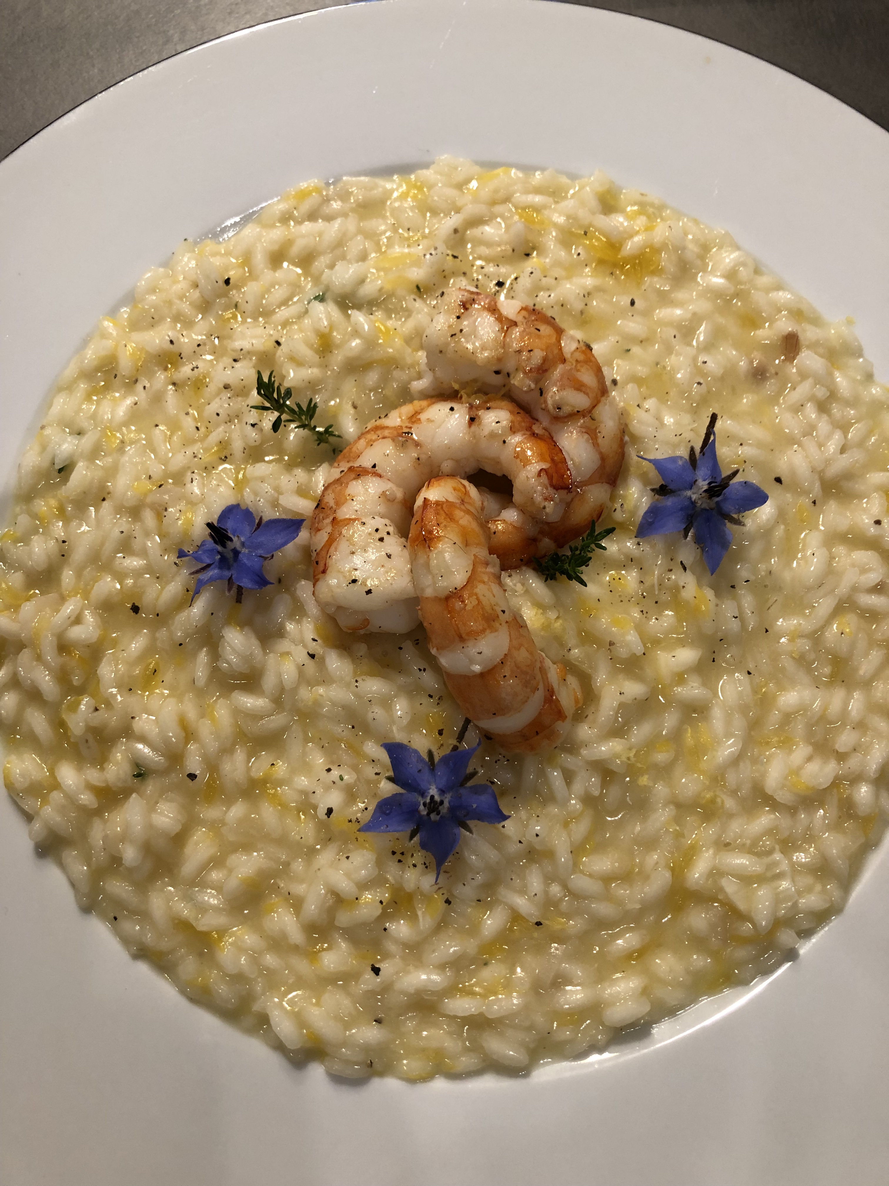 Un fantastico risotto profumato ed elegante, agrumi che danno un tocco di freschezza, io l’ho impreziosito con le code di gamberi, ma é buono anche senza, ho decorato il piatto con i fiori di borragine