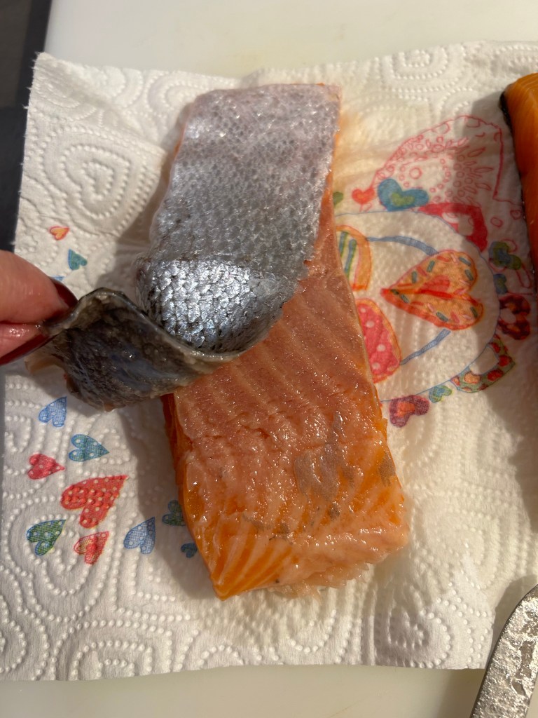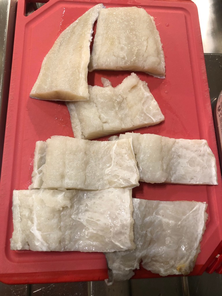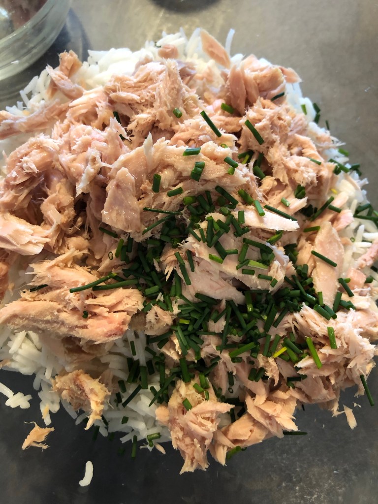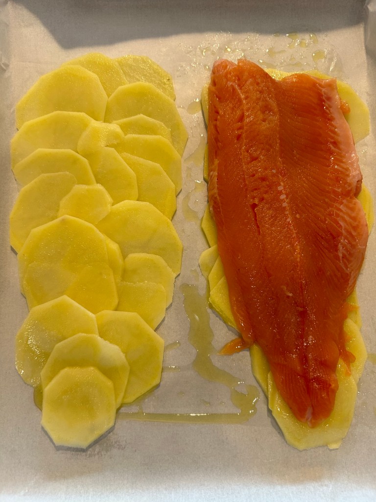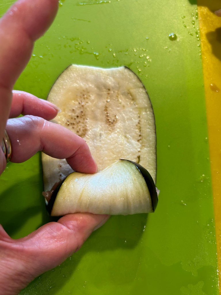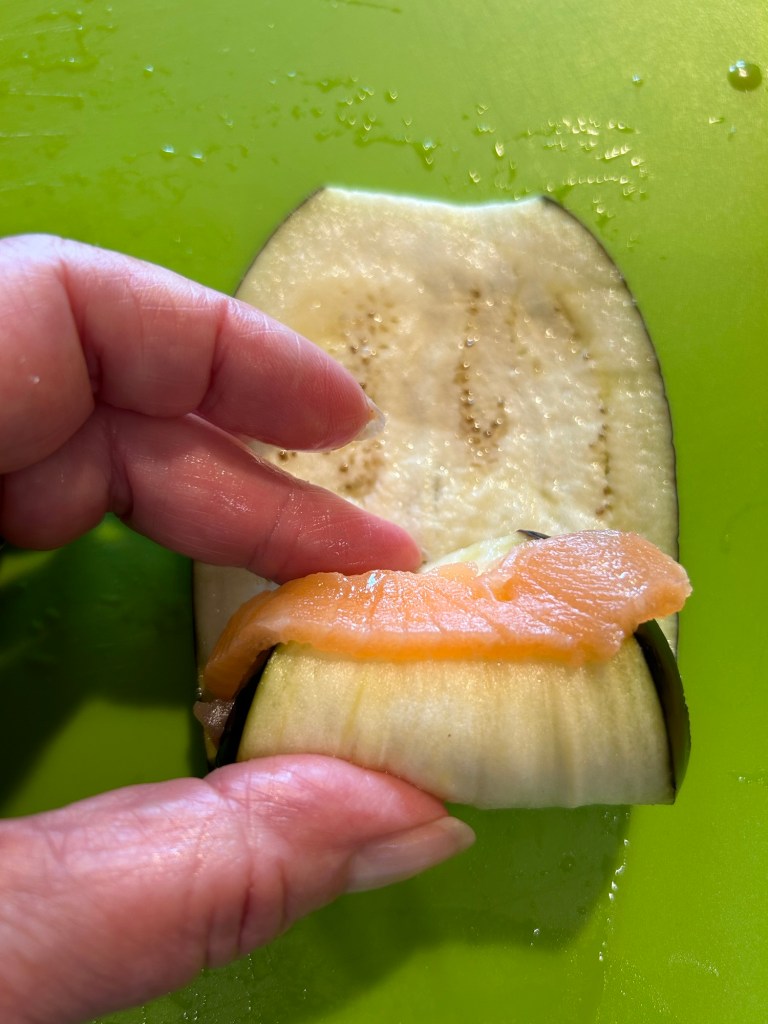 Risciacquo quindi le melanzane e le asciugo bene, intanto taglio a striscioline i filetti di pesce, dispongo una fetta, appoggio un pezzetto di tonno o il pesce che preferite