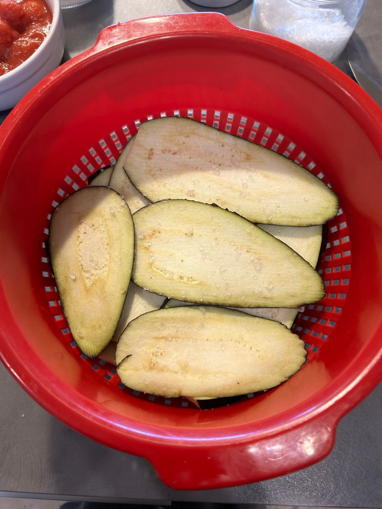 Le metto in un colapasta a strati aggiungendo del sale grosso, le lascio riposare circa mezz’ora appoggiando un piatto con un peso sopra per far perdere l’acqua e l’amaro
