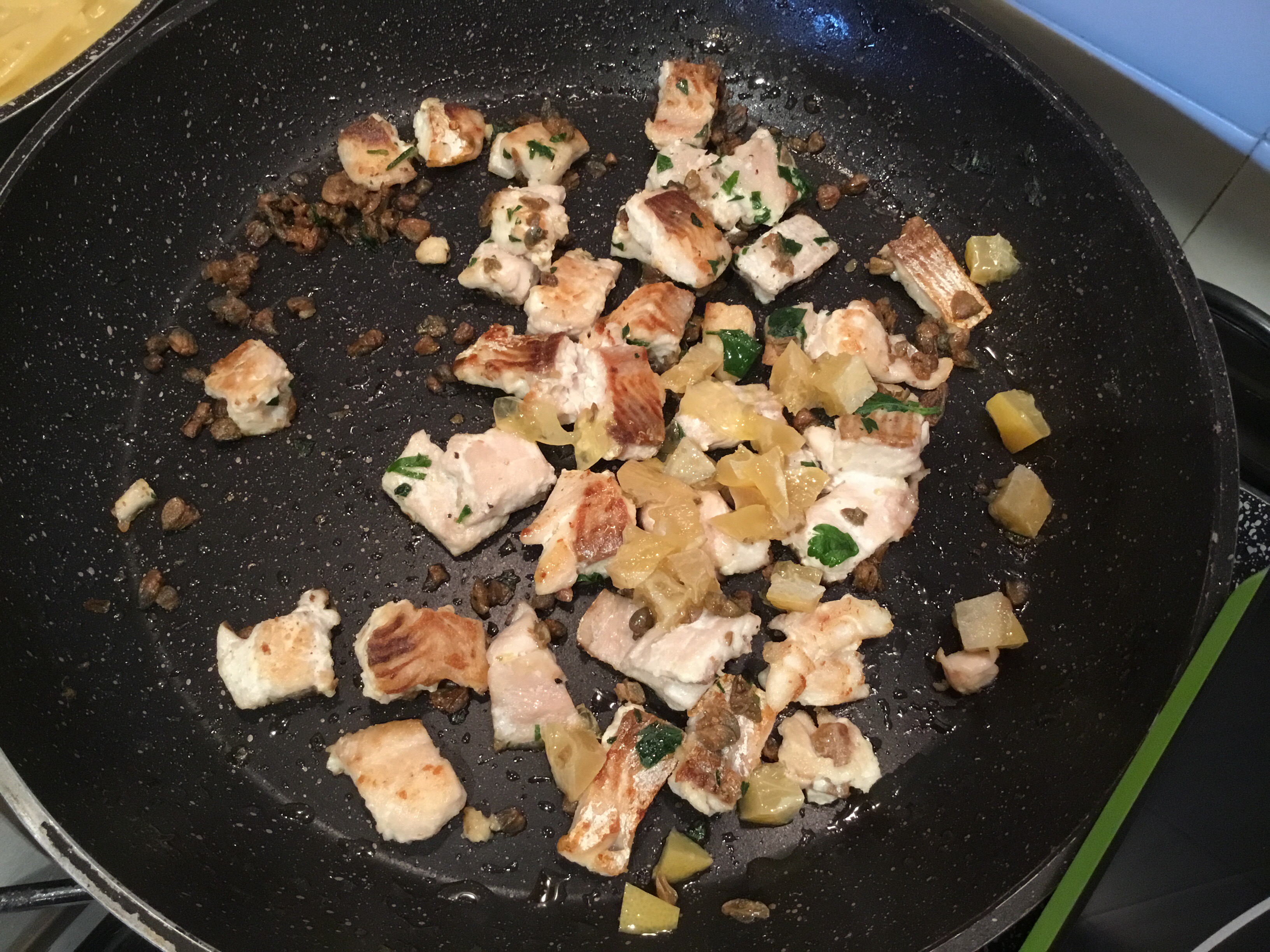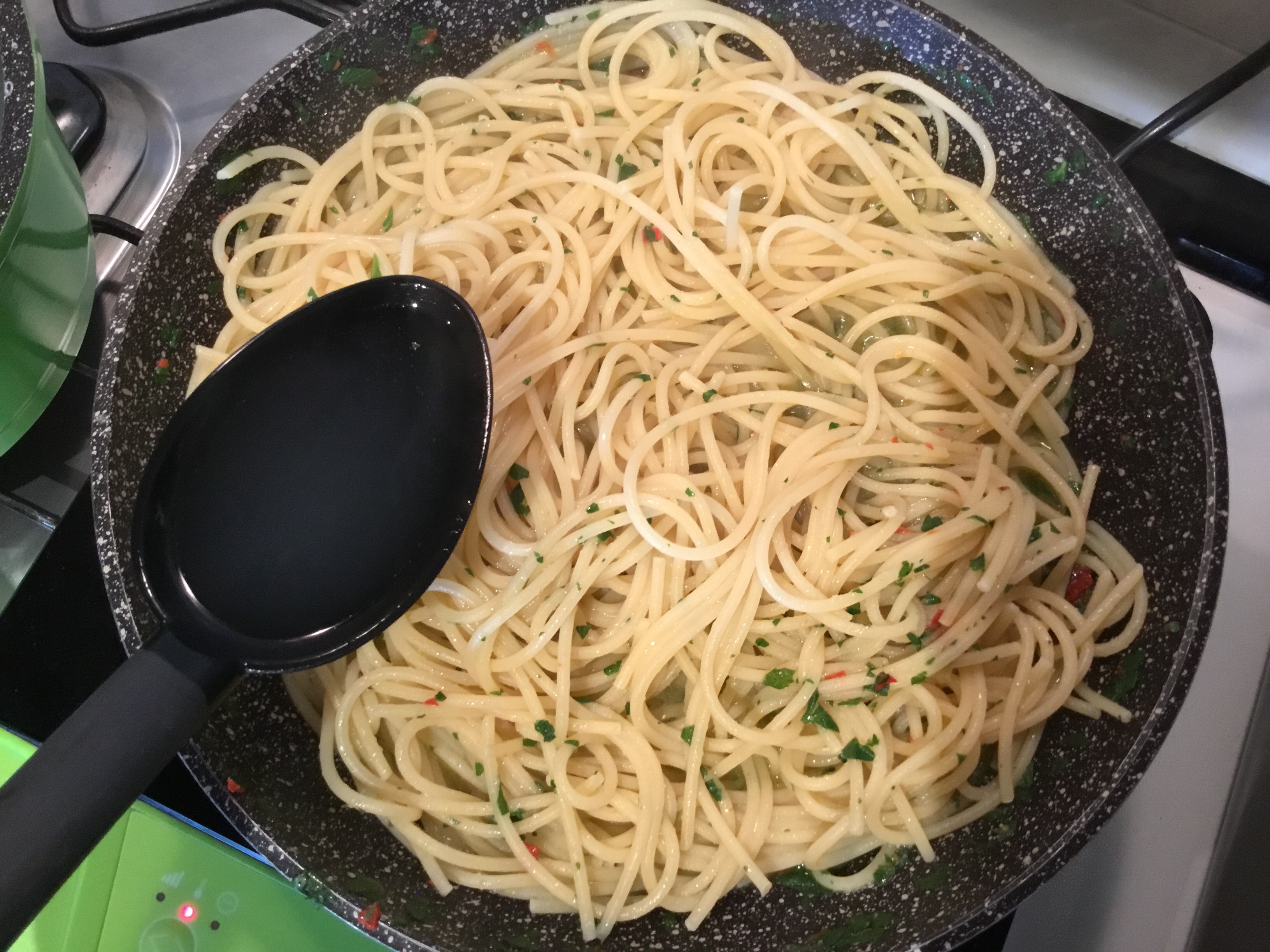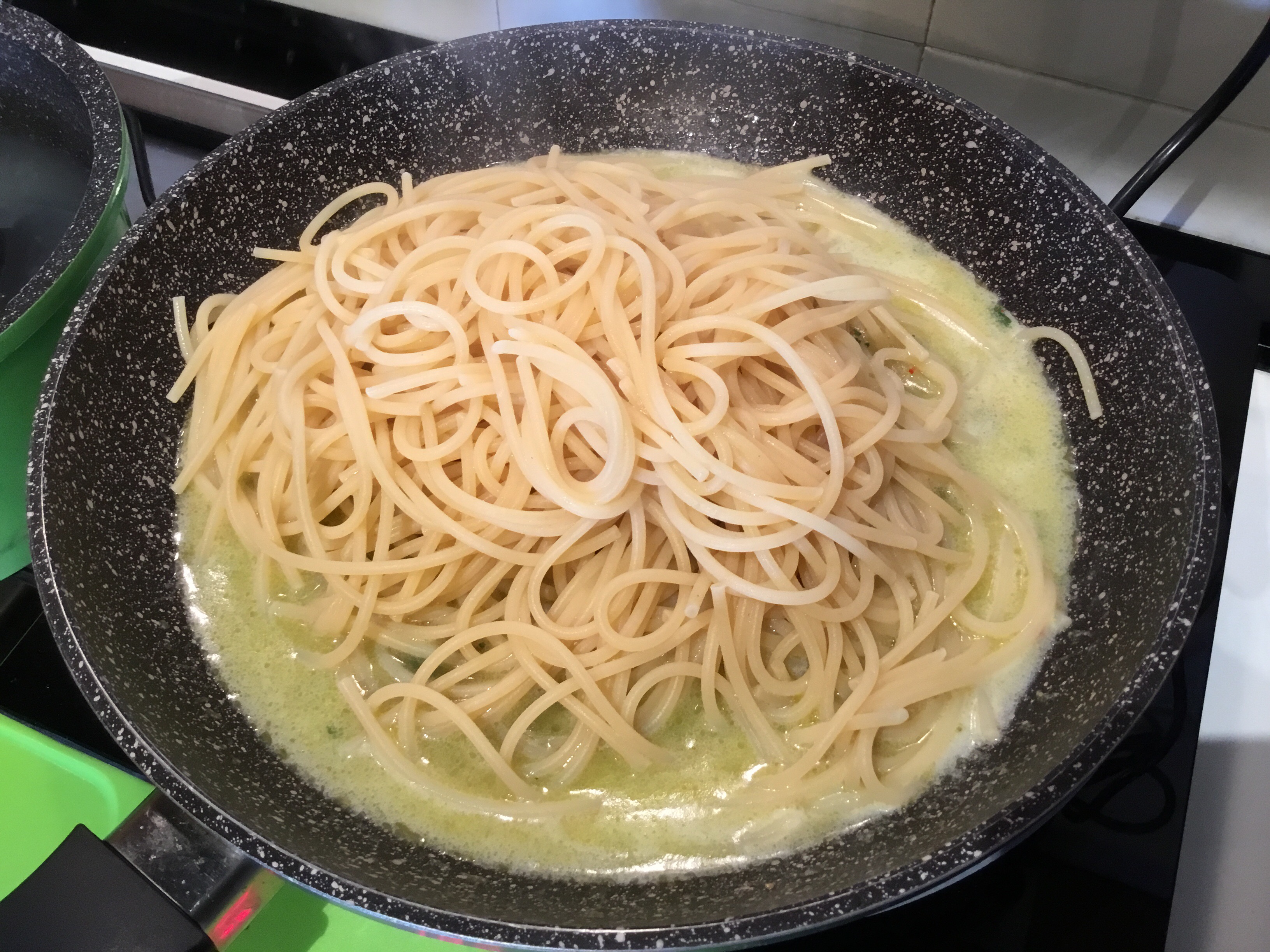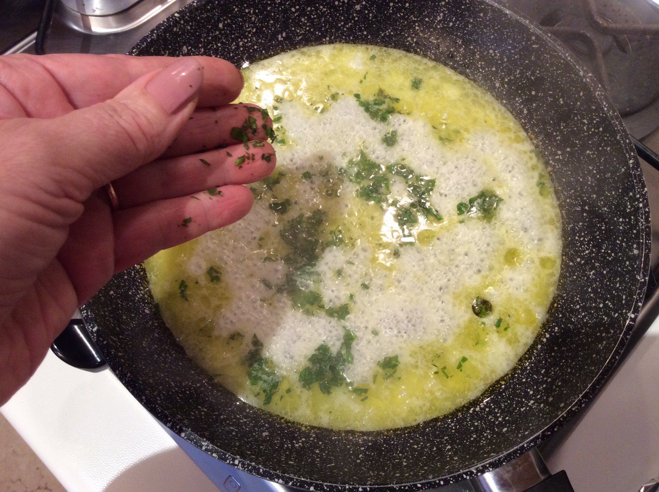 Cuocio per 5 minuti, nel frattempo cuocio gli spaghetti, aggiungo del prezzemolo tritato