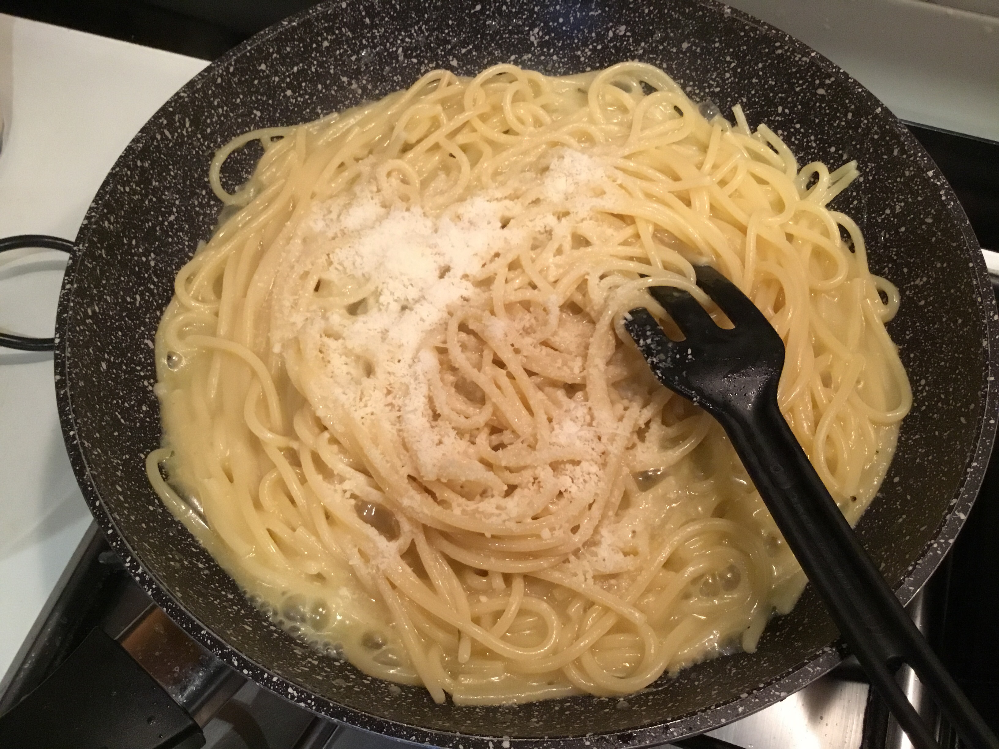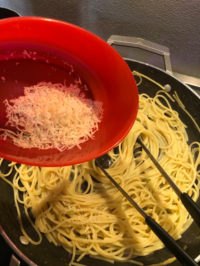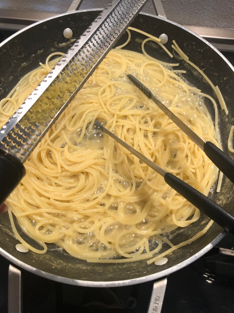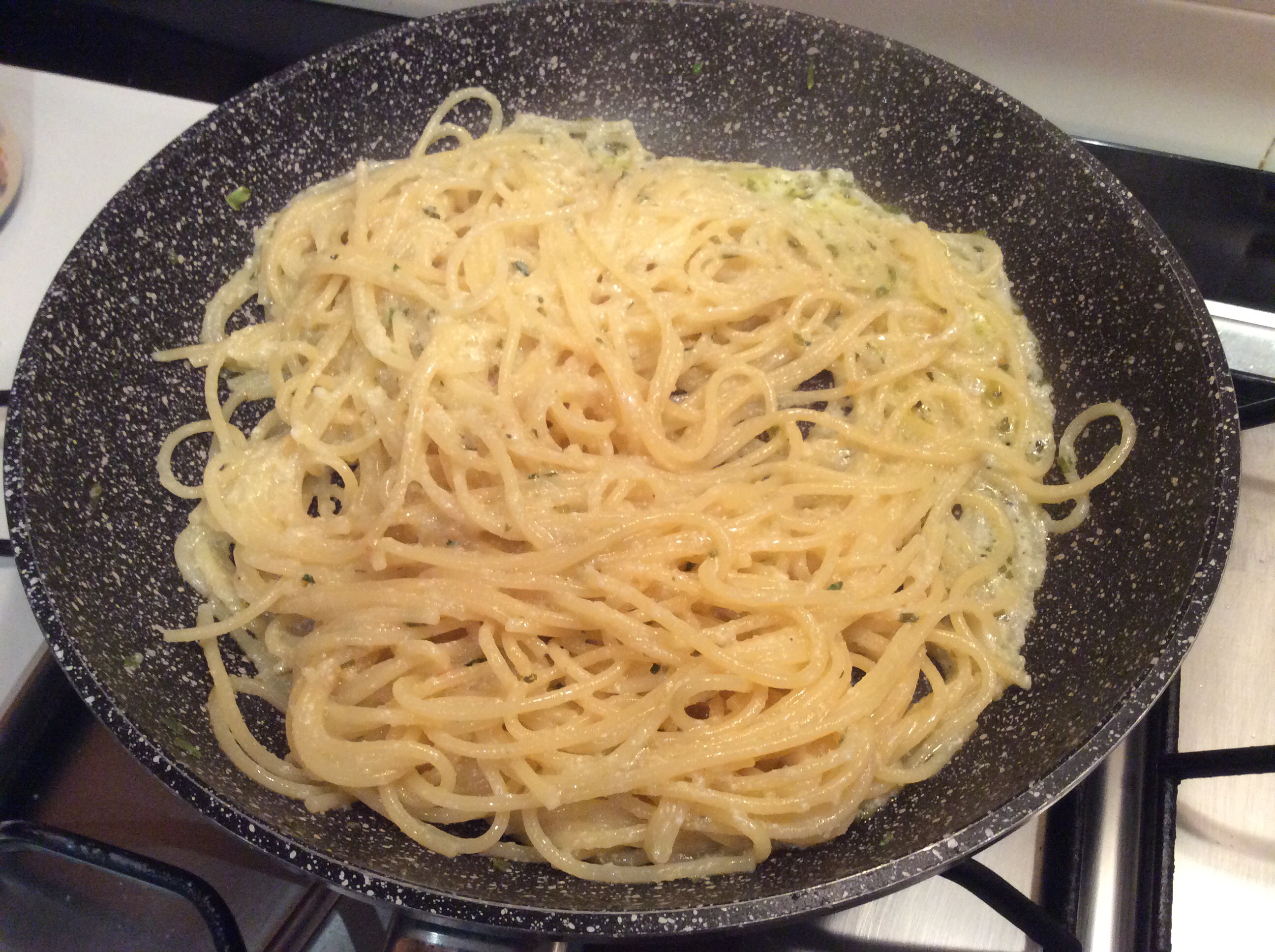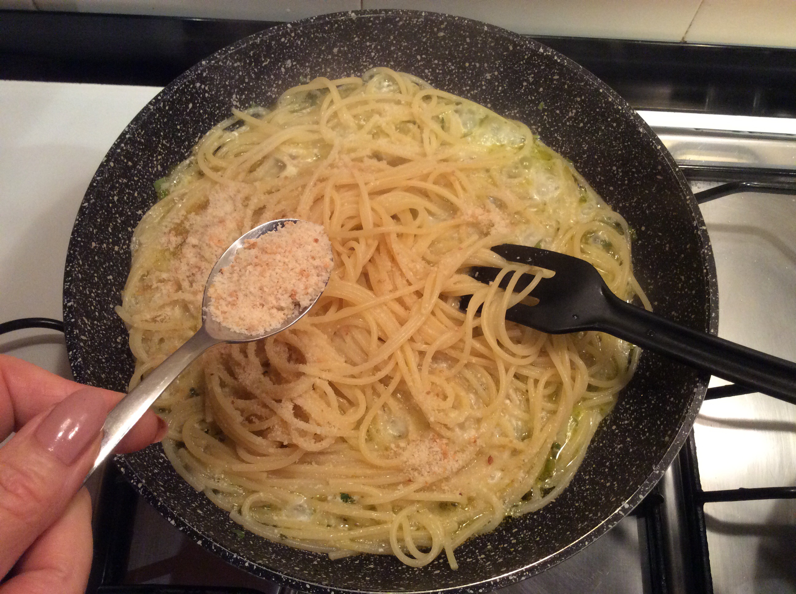 Verso gli spaghetti e manteco aggiungendo qualche cucchiaio di acqua di cottura della pasta
