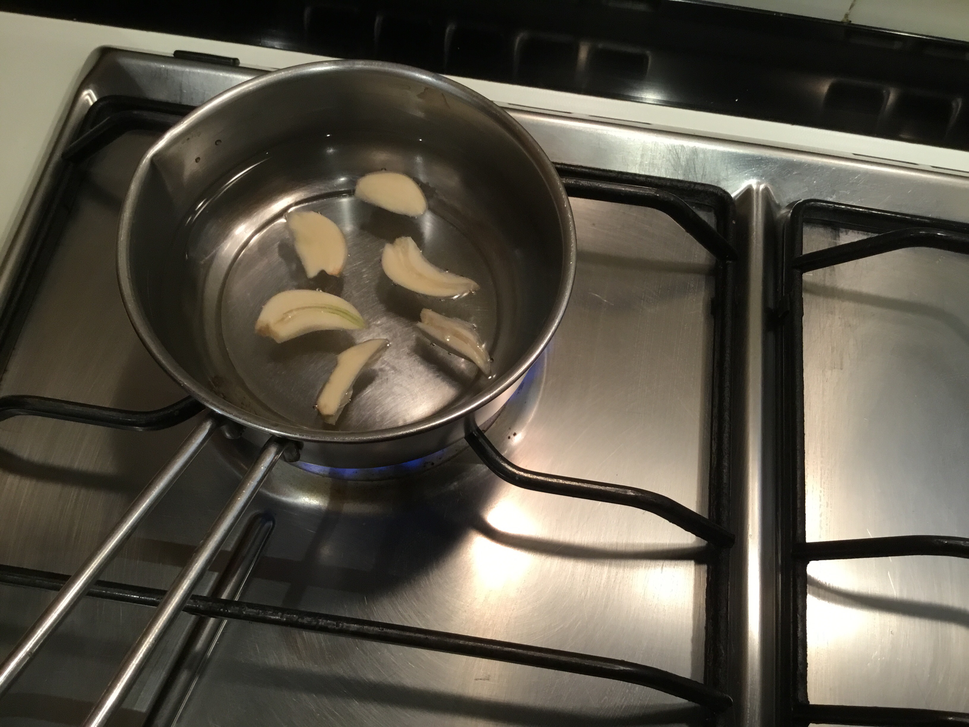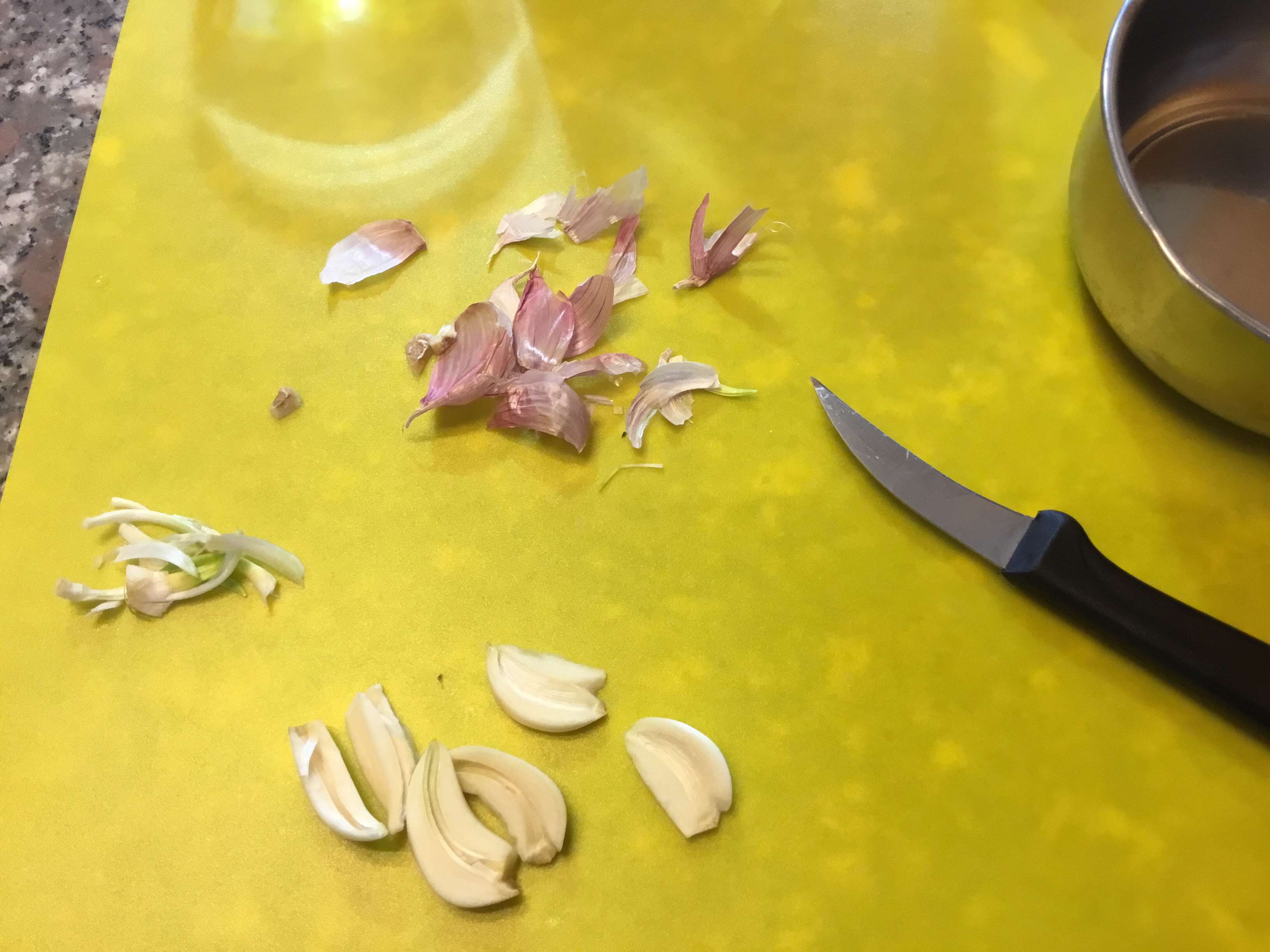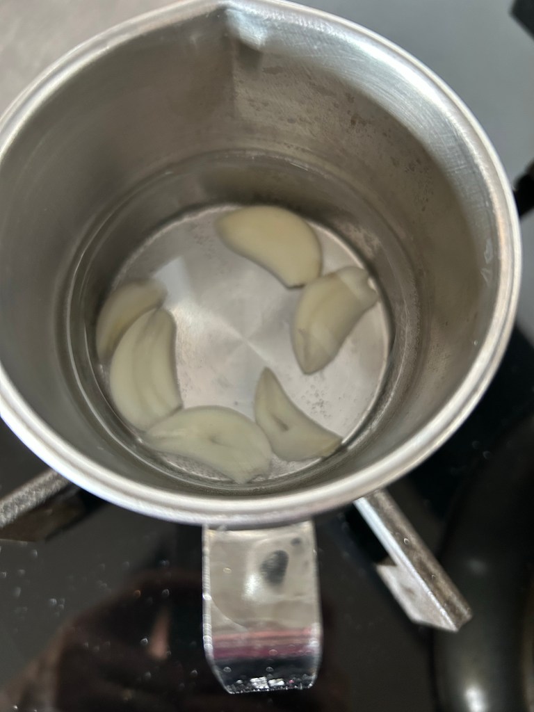 Scongelo le cozze, se avete tempo lasciatele scongelare in frigorifero, altrimenti lasciateli nella confezione chiusa e mettetele sotto l’ acqua fredda corrente, sbuccio gli spicchi di aglio, tolgo l’anima centrale e li metto in un pentolino con acqua fredda e porto a bollore