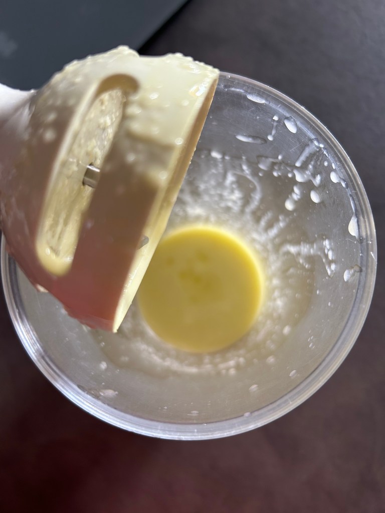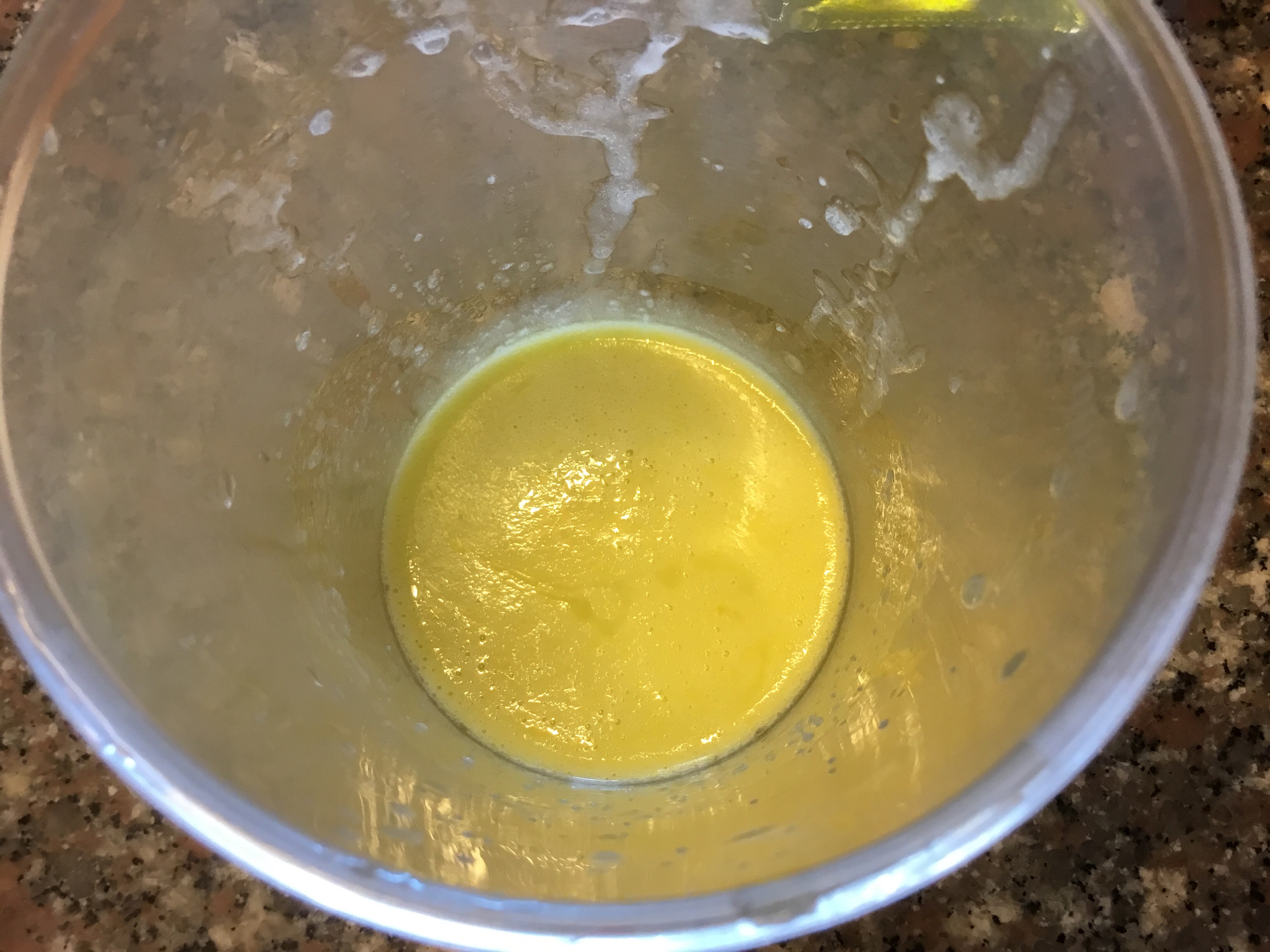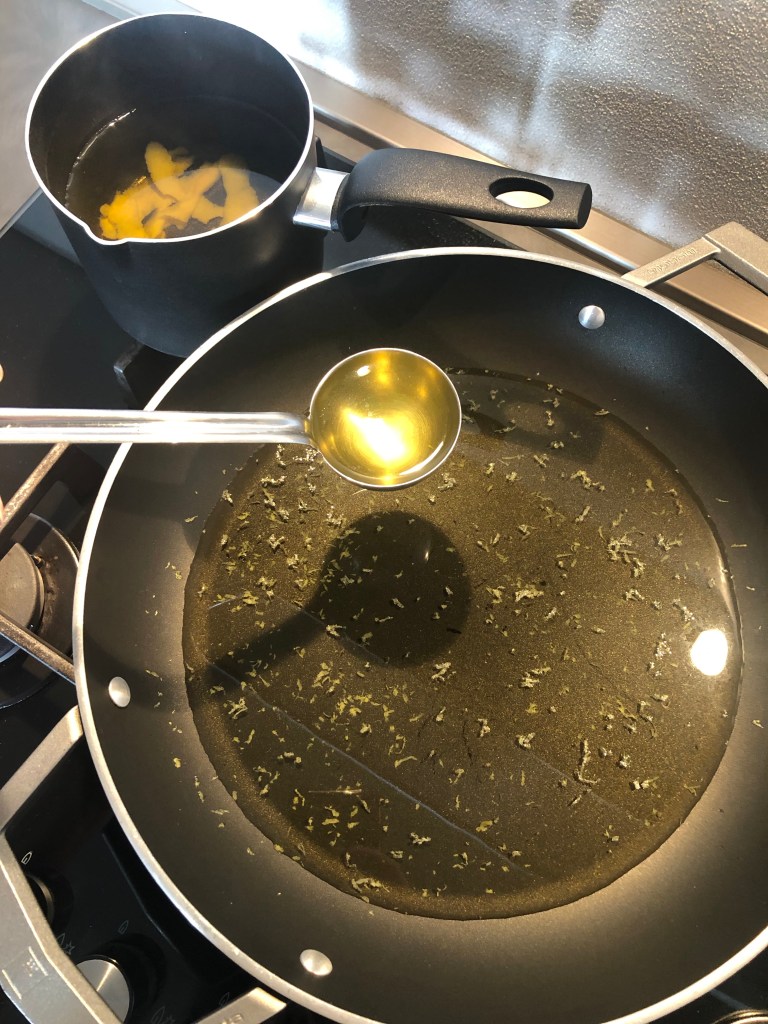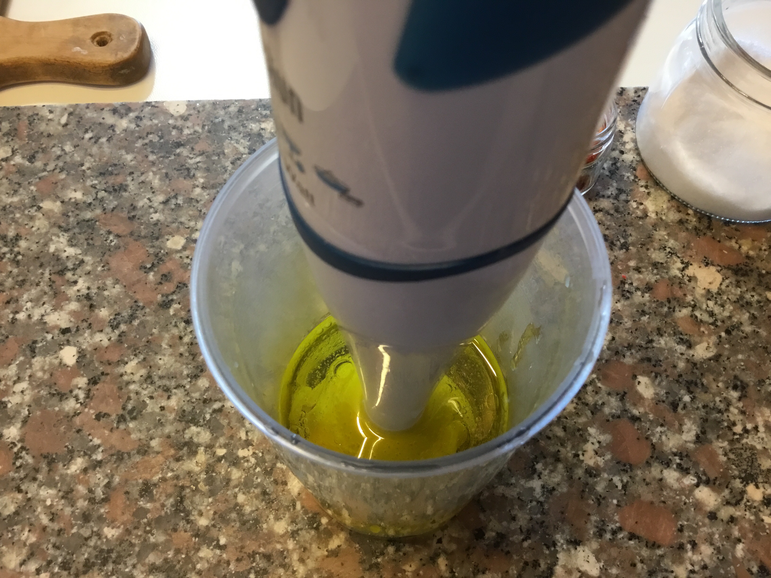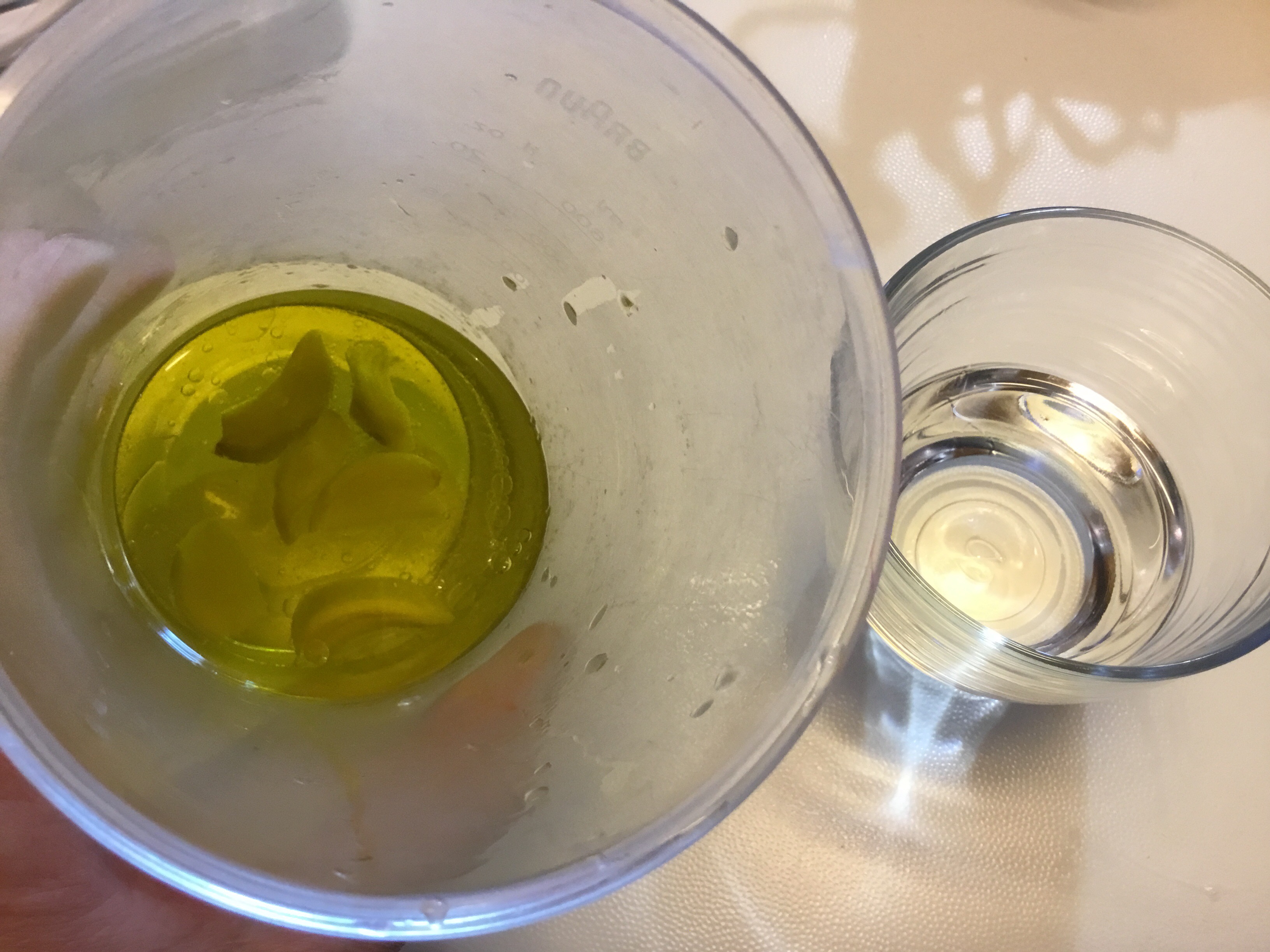 Lascio bollire un minuto, butto l’acqua e la metto pulita e riporto a bollore, così per 3 volte, li metto nel bicchiere del mixer e aggiungo circa 50 ml di olio extravergine, qualche cucchiaio di acqua di cottura della pasta che ho portato a bollore, devo ottenere una cremina semi liquida, in questo modo perderà il sapore forte dell’aglio