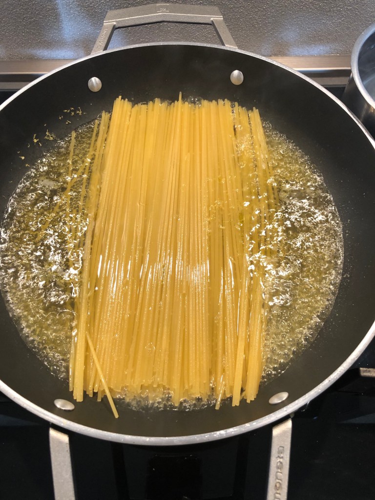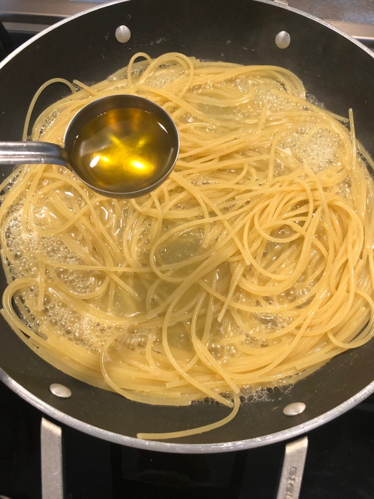 Intanto cuocio la pasta senza salare l”acqua perché aggiungo il resto del liquido delle vongole che é molto salato