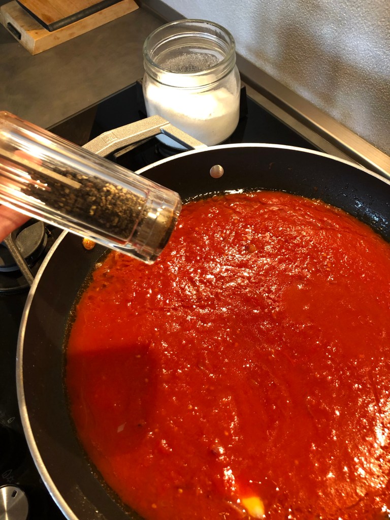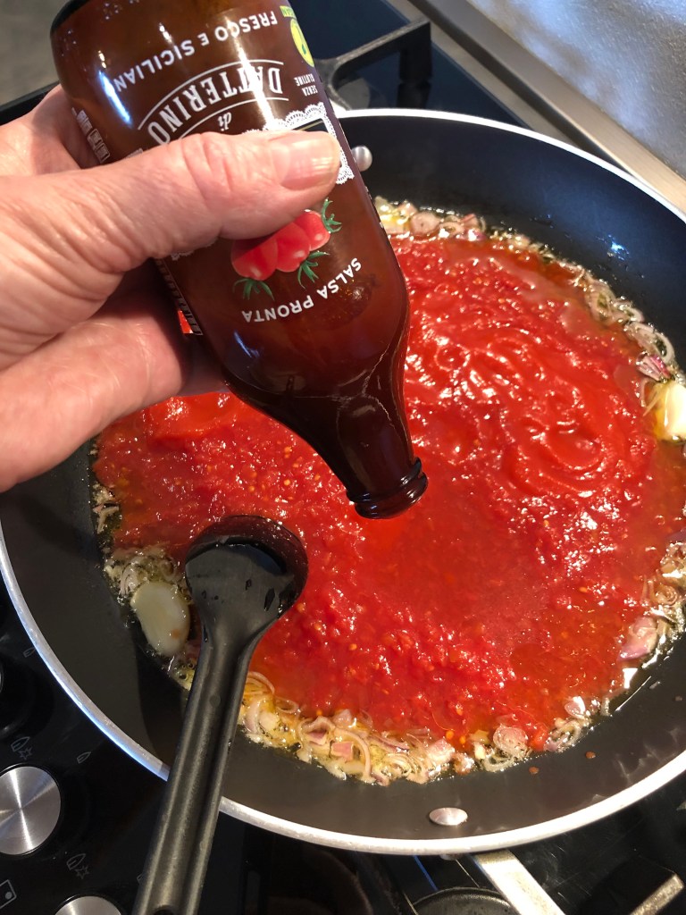 Quando iniziano a dorare unisco la salsa di pomodoro, io avevo del sugo di pomodoro al quale avevo aggiunto del peperoncino, diluisco con un bicchiere di acqua, regolo di sale e porto a cottura con il coperchio ci vorranno una decina di minuti, elimino l”aglio