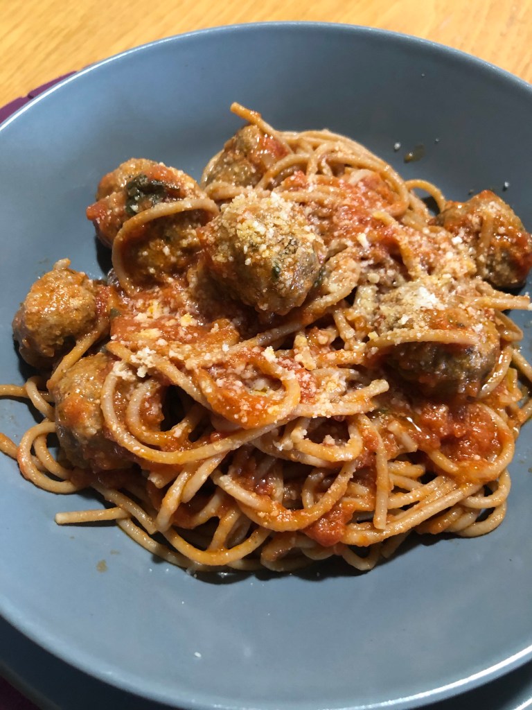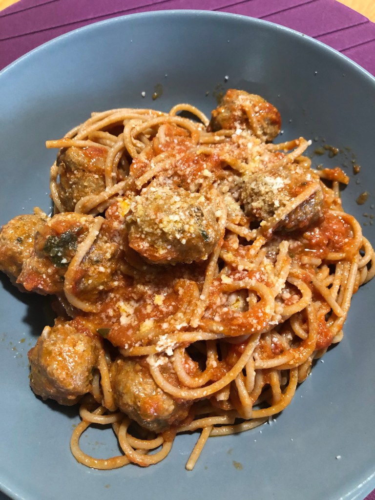 Quando gli spaghetti sono cotti li aggiungo al sugo caldo, li lascio mantecare alcuni minuti mescolando delicatamente per non rompere le polpettine, se serve unite qualche cucchiaio di acqua di cottura della pasta