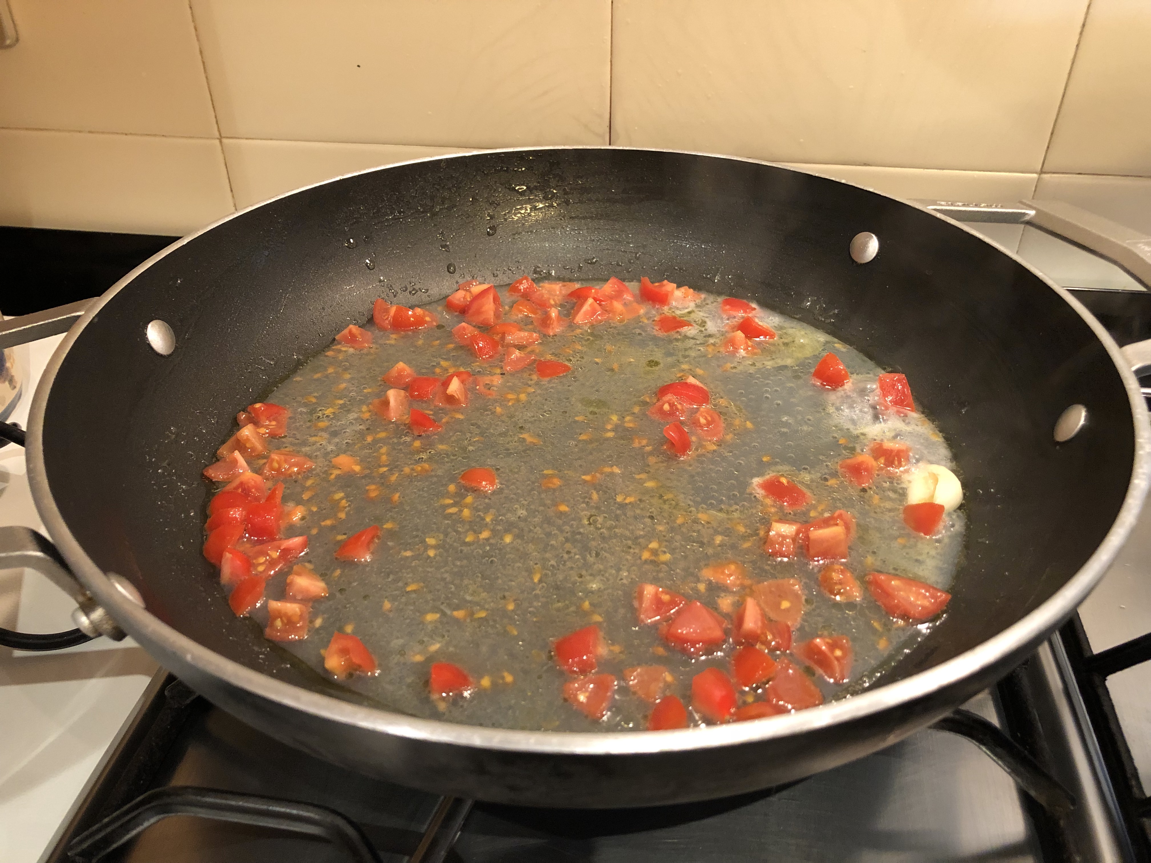 In una padella verso un goccio di olio, i pomodorini e lascio un paio di minuti poi verso metà dose di liquido delle cozze